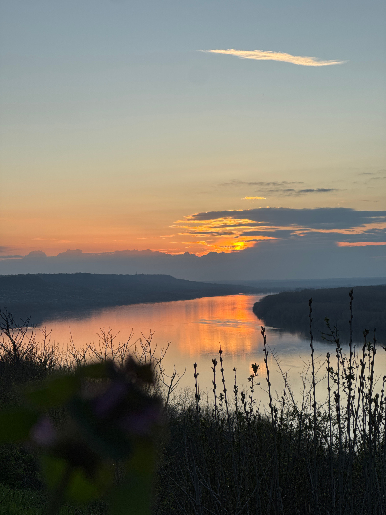 The image depicts a sunset over the Danube River, near the city of Kozloduy, Bulgaria. The sun is partially obscured by clouds, casting an orange reflection on the water. Silhouetted trees and bushes…read more