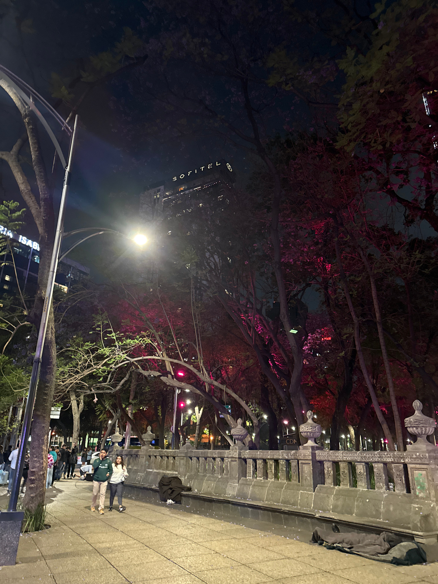 At night in Mexico City, Mexico, a group of people stand on a sidewalk near a stone wall, illuminated by streetlights and pink tree lights. The SOFITEL building is visible in the background, indicatin…read more