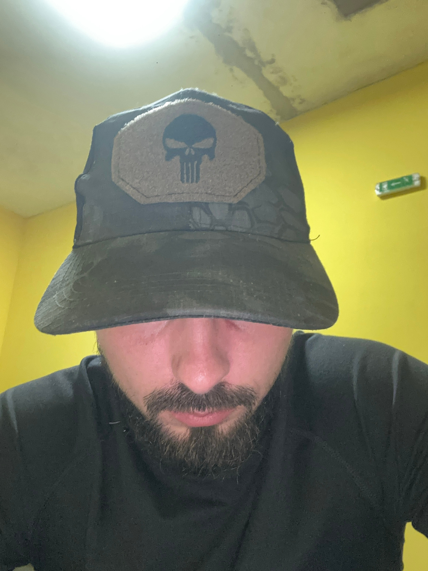 A man with a beard and wearing a black hoodie is shown from a low angle. He is also wearing a baseball cap with a Punisher skull patch. The background is a yellow wall with what appears to be paint da…read more