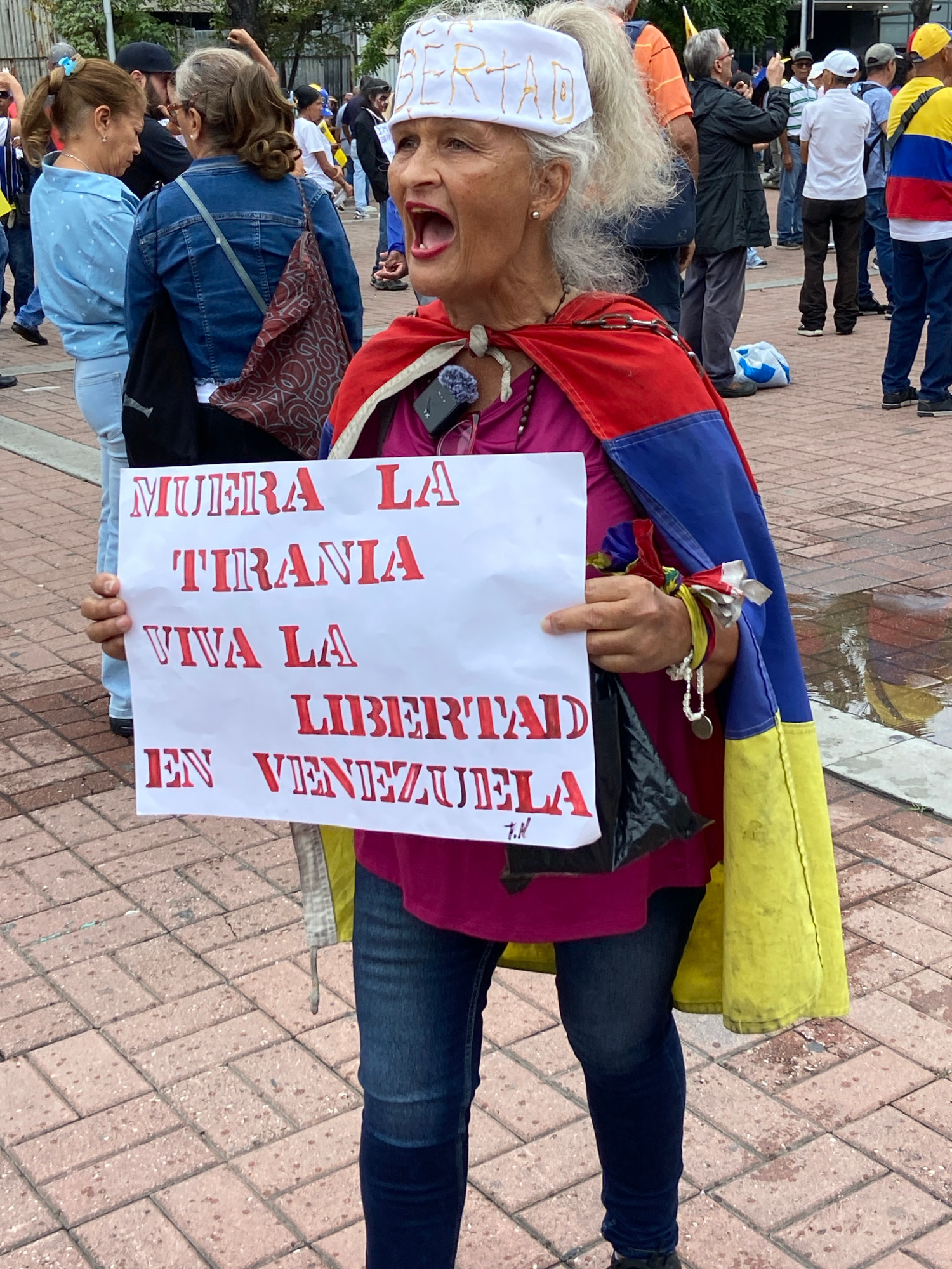 An outdoor protest or demonstration is depicted in what appears to be a paved public square or street in Caracas, Venezuela. The central figure is an older woman with grey, curly hair, seen from the c…read more