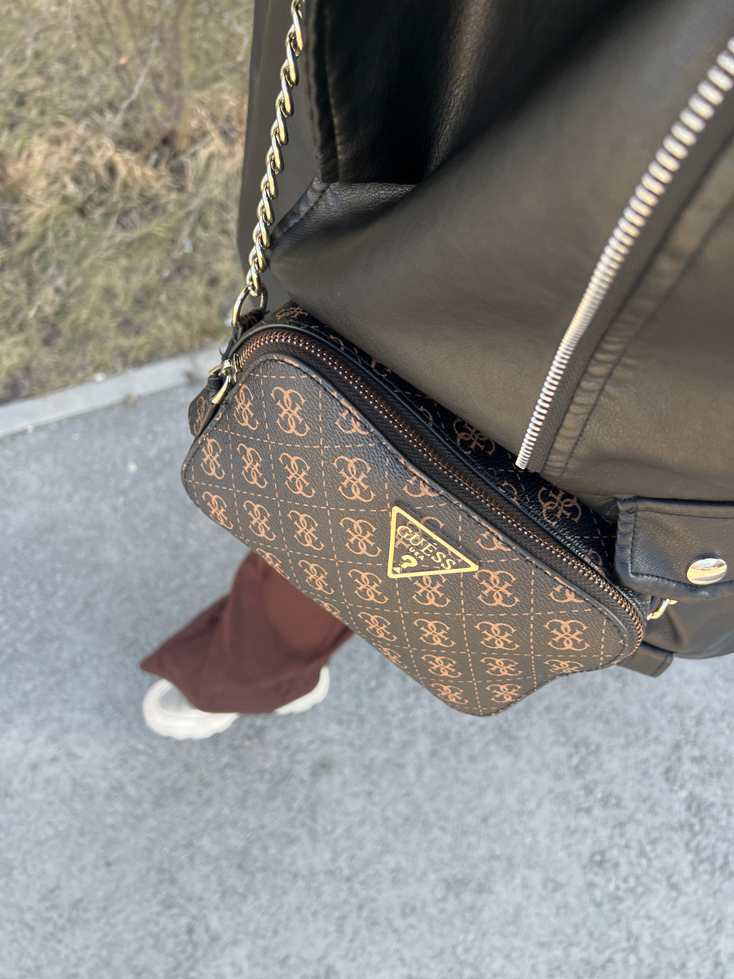 A first-person perspective shows a person wearing brown pants and white sneakers, carrying a black leather jacket with a silver zipper, and a brown Guess brand handbag with a gold logo. The person is…read more