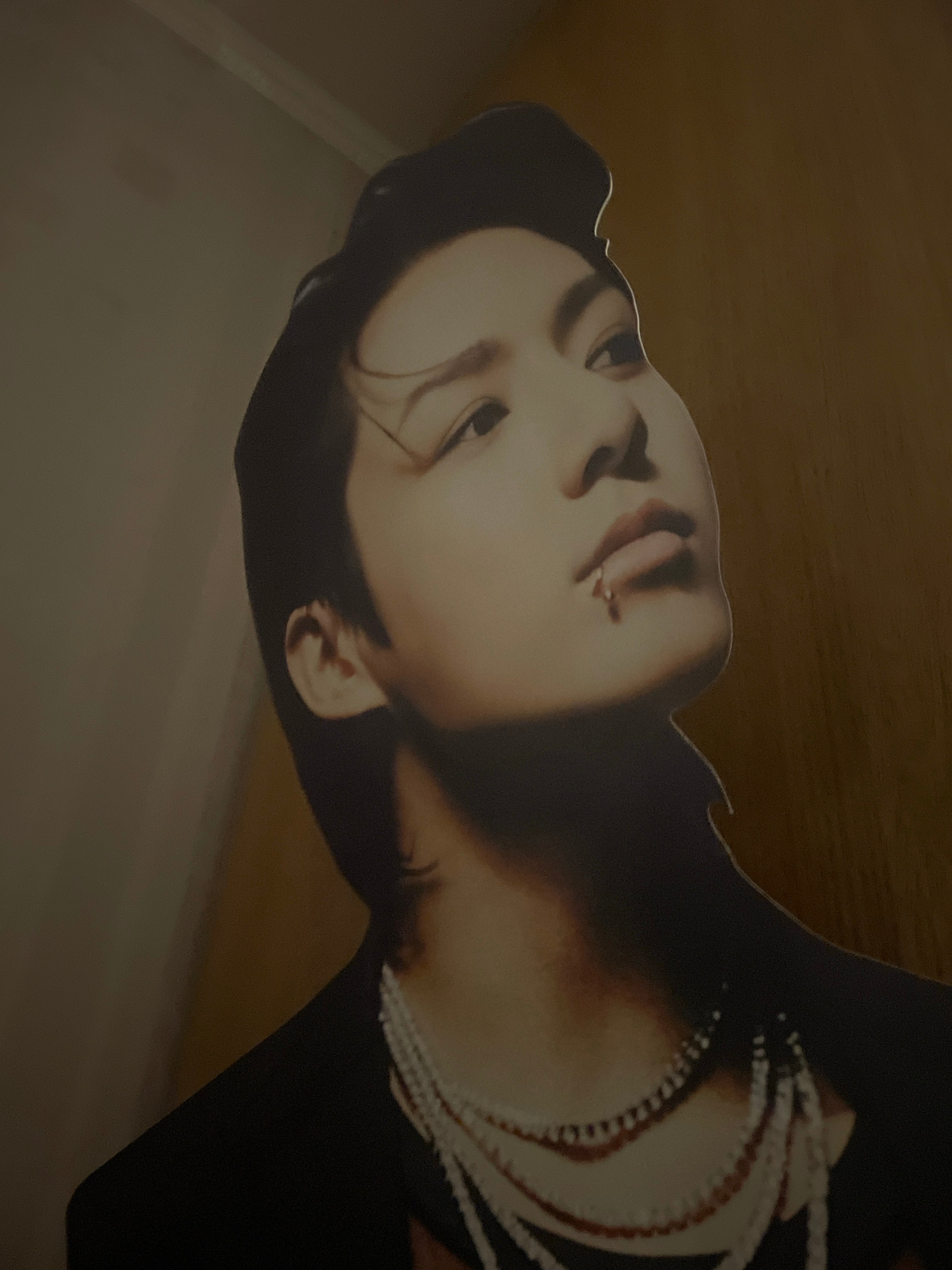 The image displays a tilted, close-up view of a cardboard cut-out featuring a person's head and upper torso. The individual depicted appears to be East Asian, with dark hair and a fair complexion. Theβ¦read more