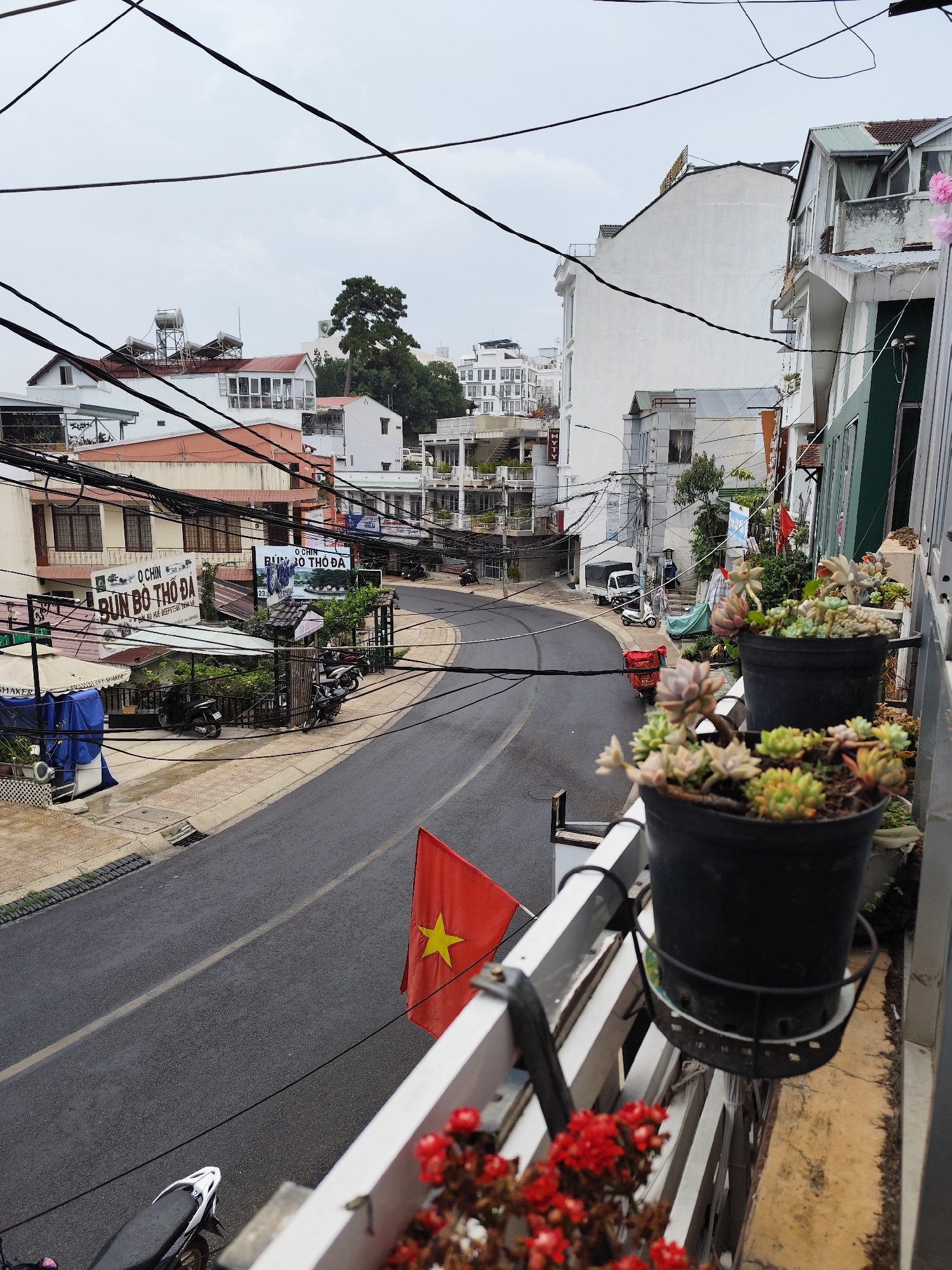 A street scene in Da Lat, Vietnam, observed from an elevated perspective, reveals a narrow asphalt road curving gently between buildings. A Vietnamese flag hangs from a balcony. Power lines crisscross…read more