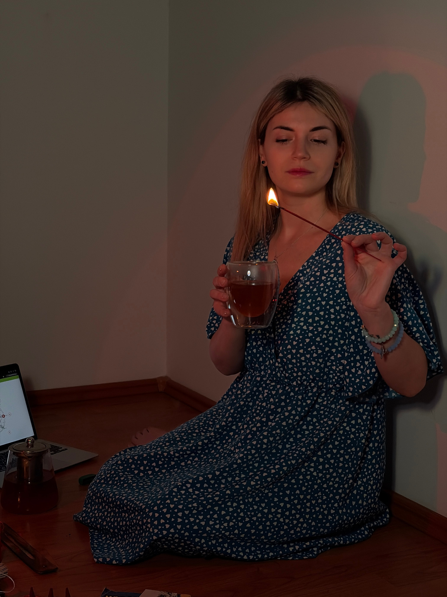 A young woman with blond hair, wearing a blue dress with white hearts, is positioned in the corner of a room. She is holding a clear glass mug filled with a dark liquid, potentially tea, and an incens…read more
