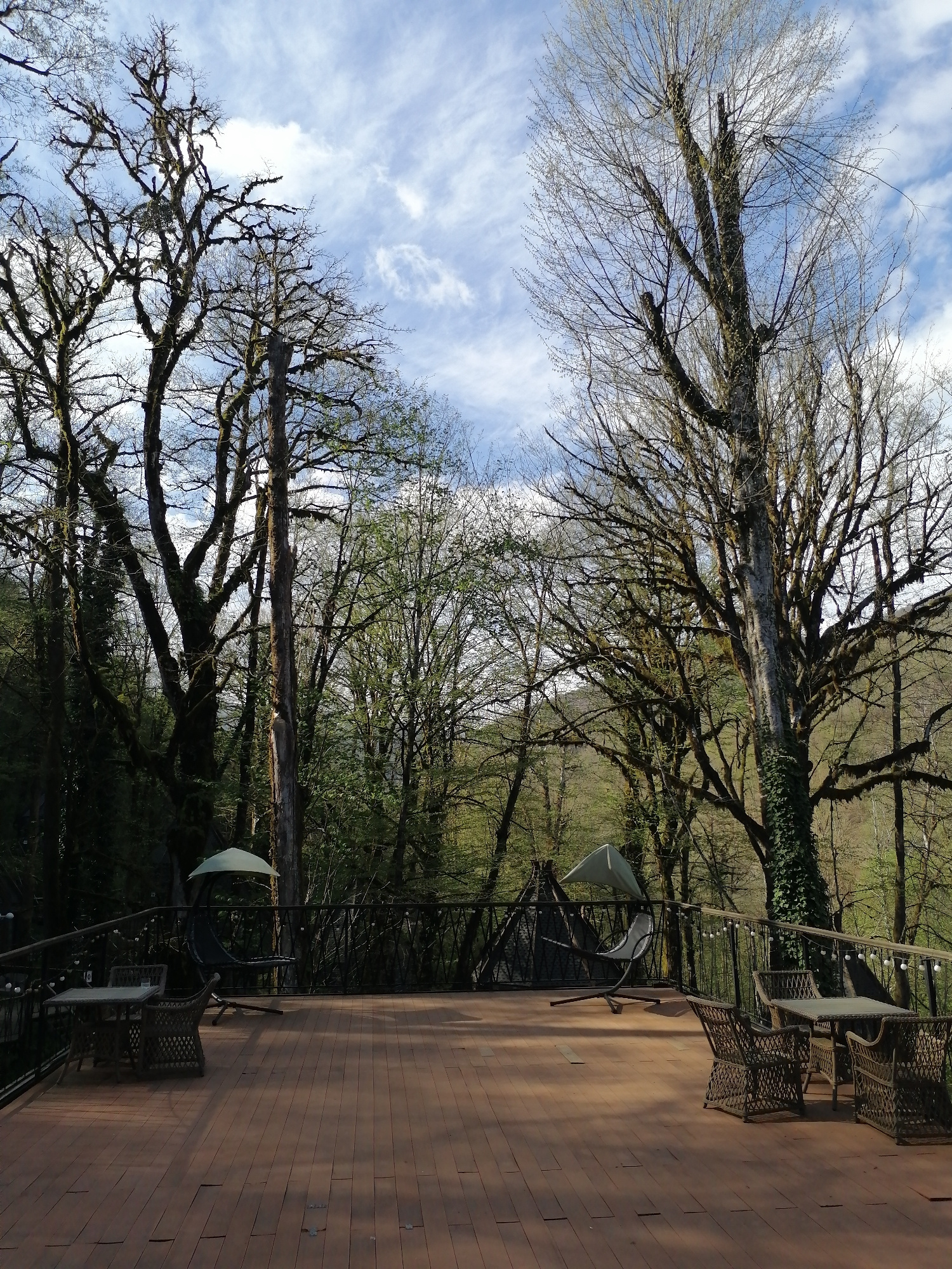 The image displays an elevated wooden deck situated within a dense forest, likely in Medoveevka, Russia. The deck, constructed from brown planks, features two sets of outdoor furniture, each consistin…read more