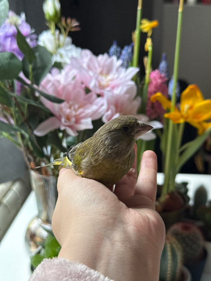 A small olive-green bird with a light grey beak and dark eyes rests securely in an open human palm. The bird exhibits subtle yellow-lime accents on its wings and tail feathers. The hand has light skin…read more
