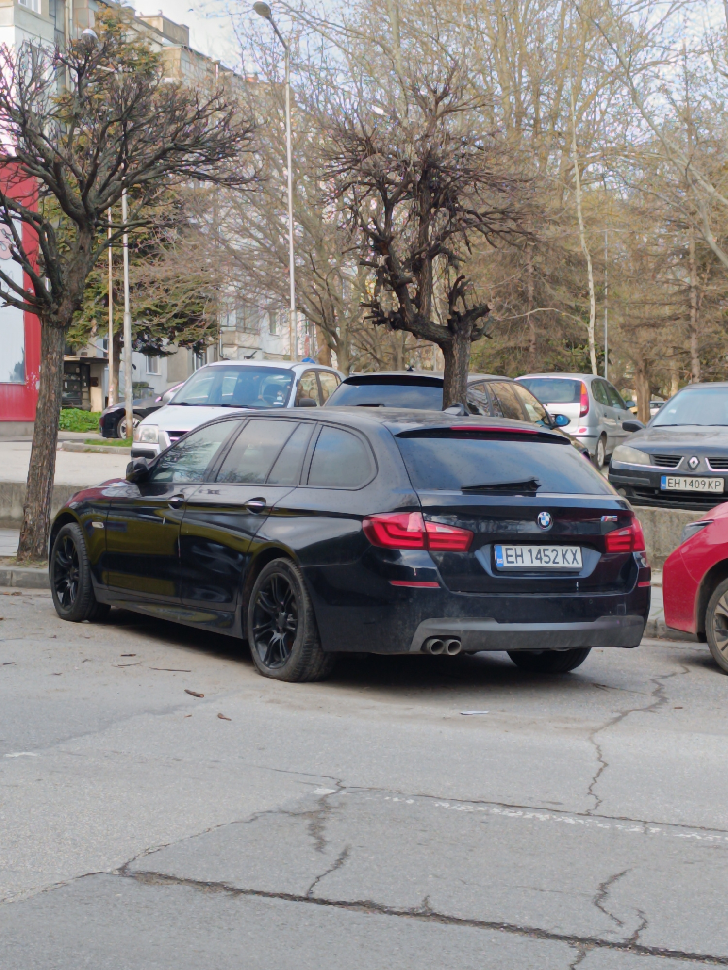 The image captures a black BMW station wagon parked on a cracked asphalt surface. The car, bearing a Bulgarian license plate "EH 1452 KX," is flanked by other vehicles, including a red car to the righ…read more