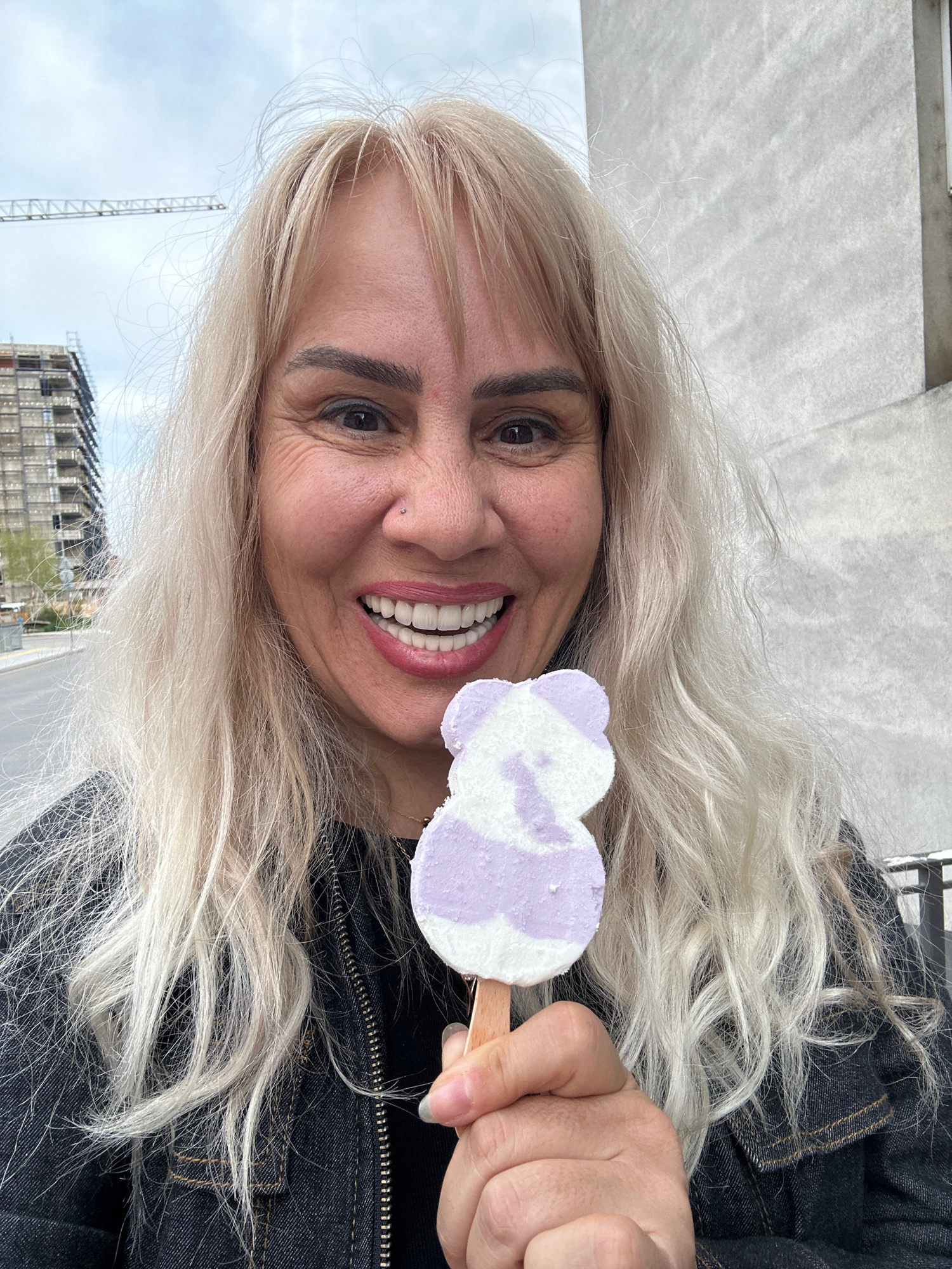 The image, oriented vertically, captures a cheerful woman with long, flowing platinum blonde hair smiling broadly towards the camera. Her dark eyebrows contrast with her light hair, and she has brown…read more