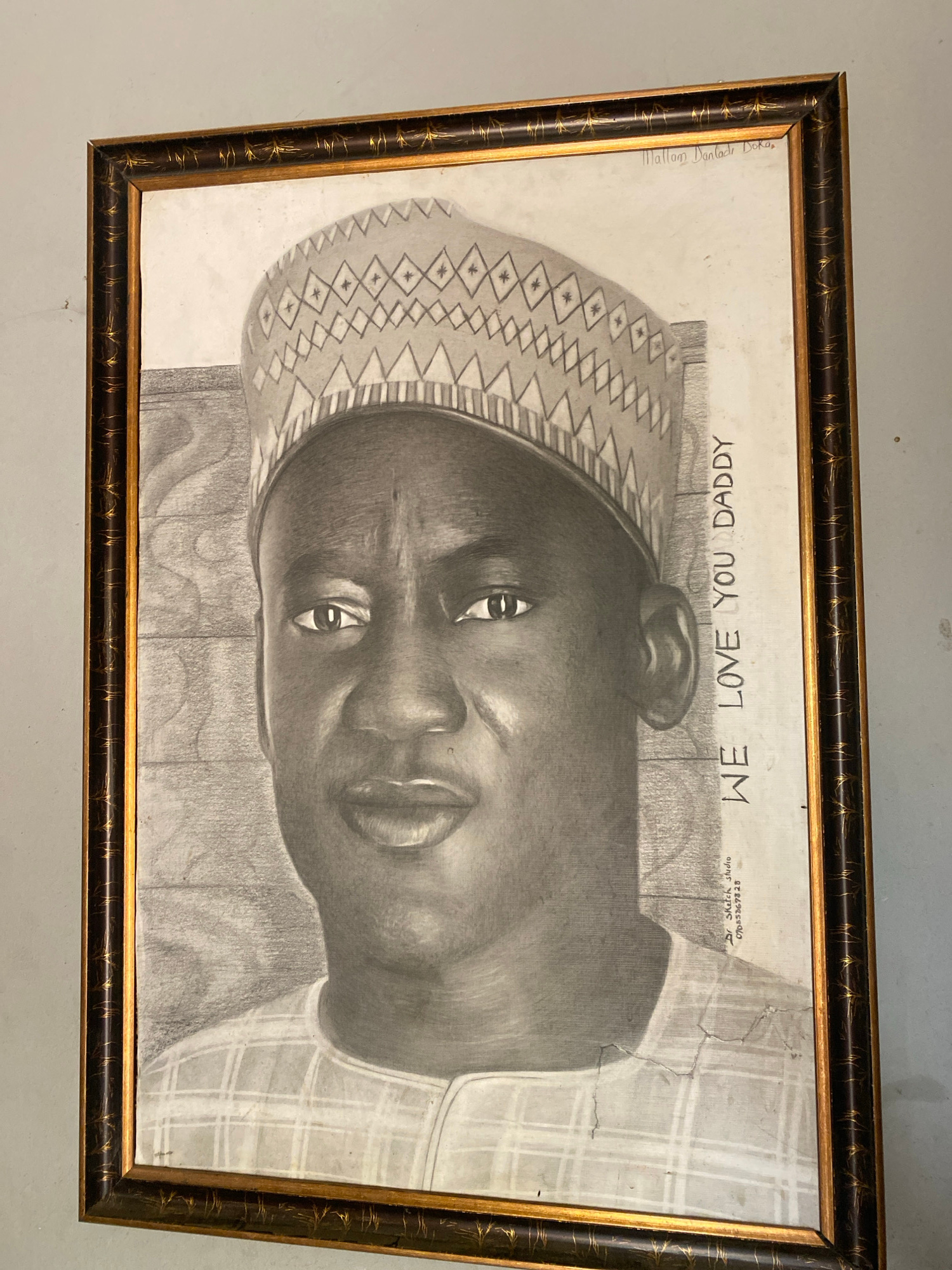 The image shows a framed pencil drawing of a man. The man in the drawing is Black and wearing a patterned cap. The drawing also includes the text "WE LOVE YOU DADDY." The artwork is credited to Mallam…read more
