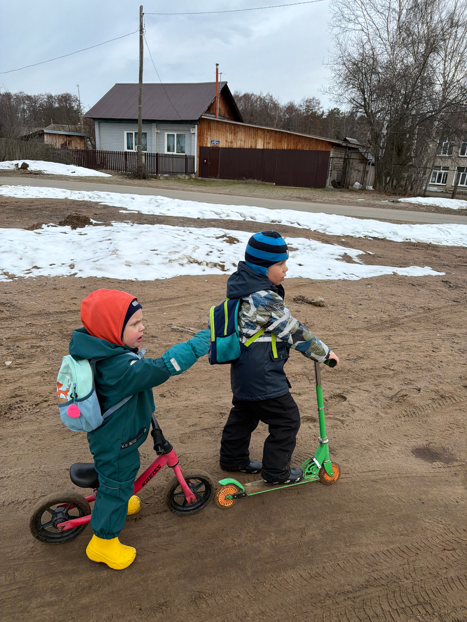 Two young boys are on a dirt and snowy patch of land near a road. One boy is on a green scooter with orange wheels, wearing a blue and black hat, a jacket with a patterned design, and dark pants. Theβ¦read more