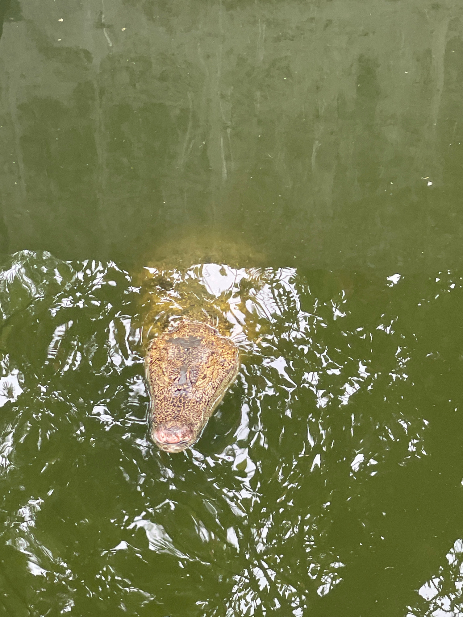 The image displays the head and upper back of a crocodilian, partially submerged in murky, olive-green water. The animal's head, positioned in the lower-central portion of the frame, exhibits a textur…read more
