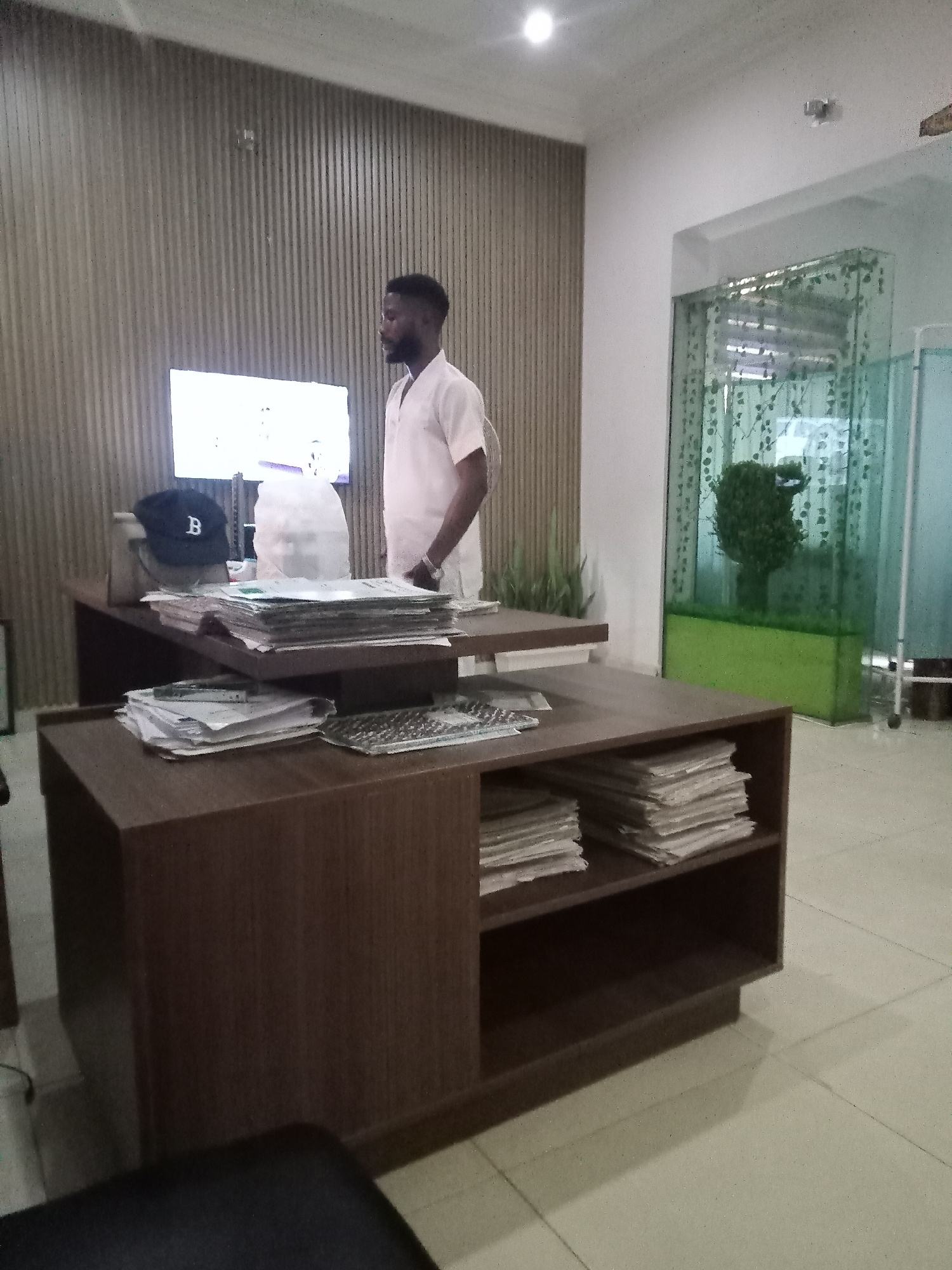 The image depicts an office interior in Gwarinpa, Nigeria. A man with a beard and short hair, wearing a white shirt, is standing next to a desk. The desk is made of dark brown wood and has two levels.…read more