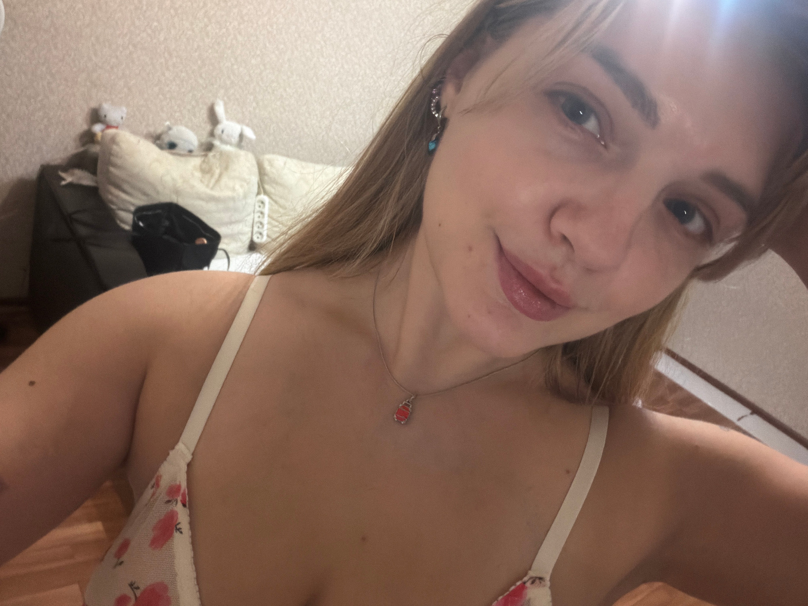 A woman with fair skin, blue eyes, and blonde hair is looking at the camera. She is wearing a white bra with a pink floral pattern and a silver necklace with a red pendant. She is indoors with a pillo…read more