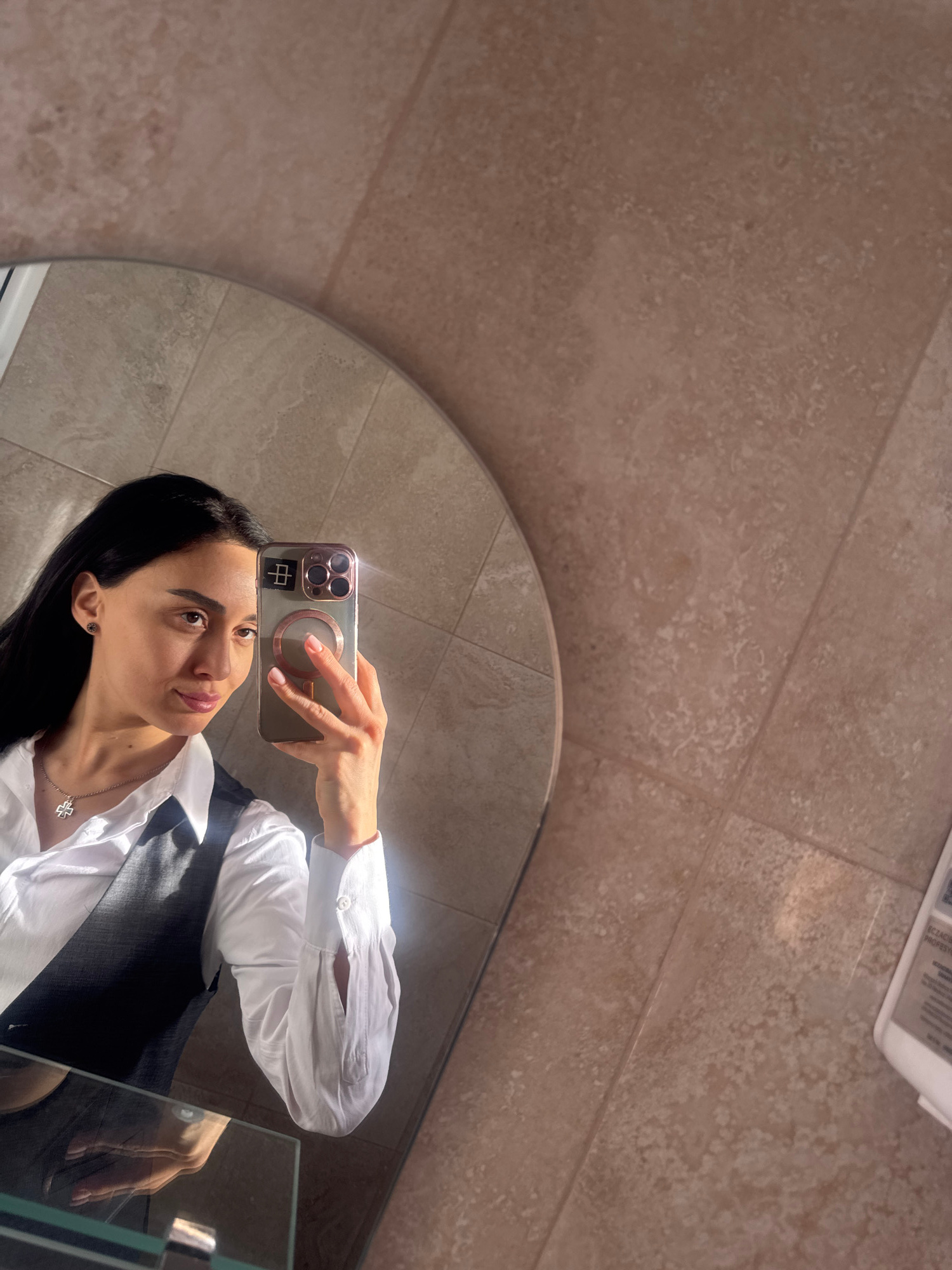 A person with dark hair is taking a selfie in a mirror. The person is wearing a white button-down shirt and a dark vest. The phone is held up to their face, obscuring some of their features. The backg…read more