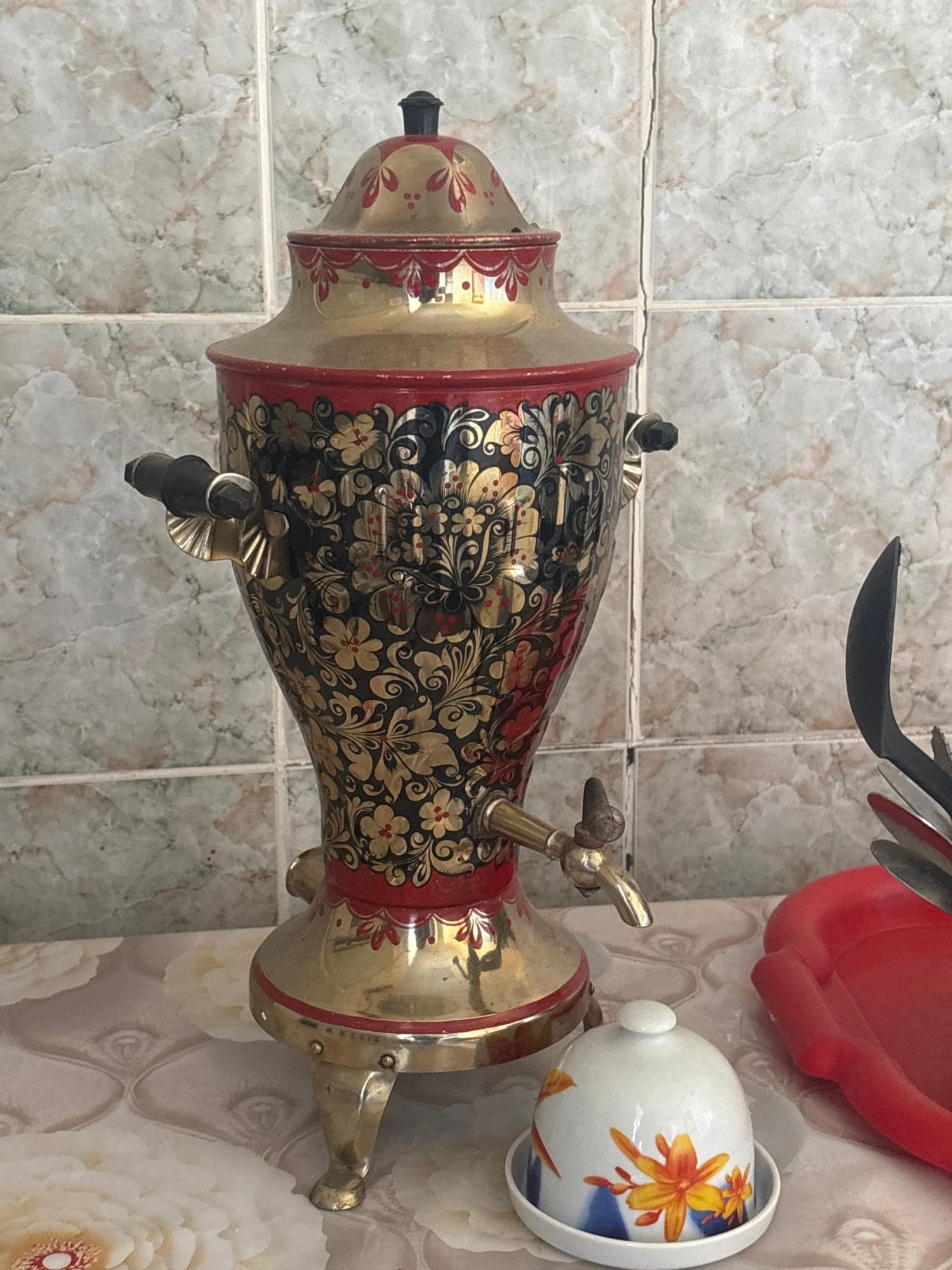 This image captures a close-up, vertically oriented view of a traditional Russian samovar, set against a tiled and wallpapered background in what appears to be a kitchen or dining area in Chaikovsky,…read more