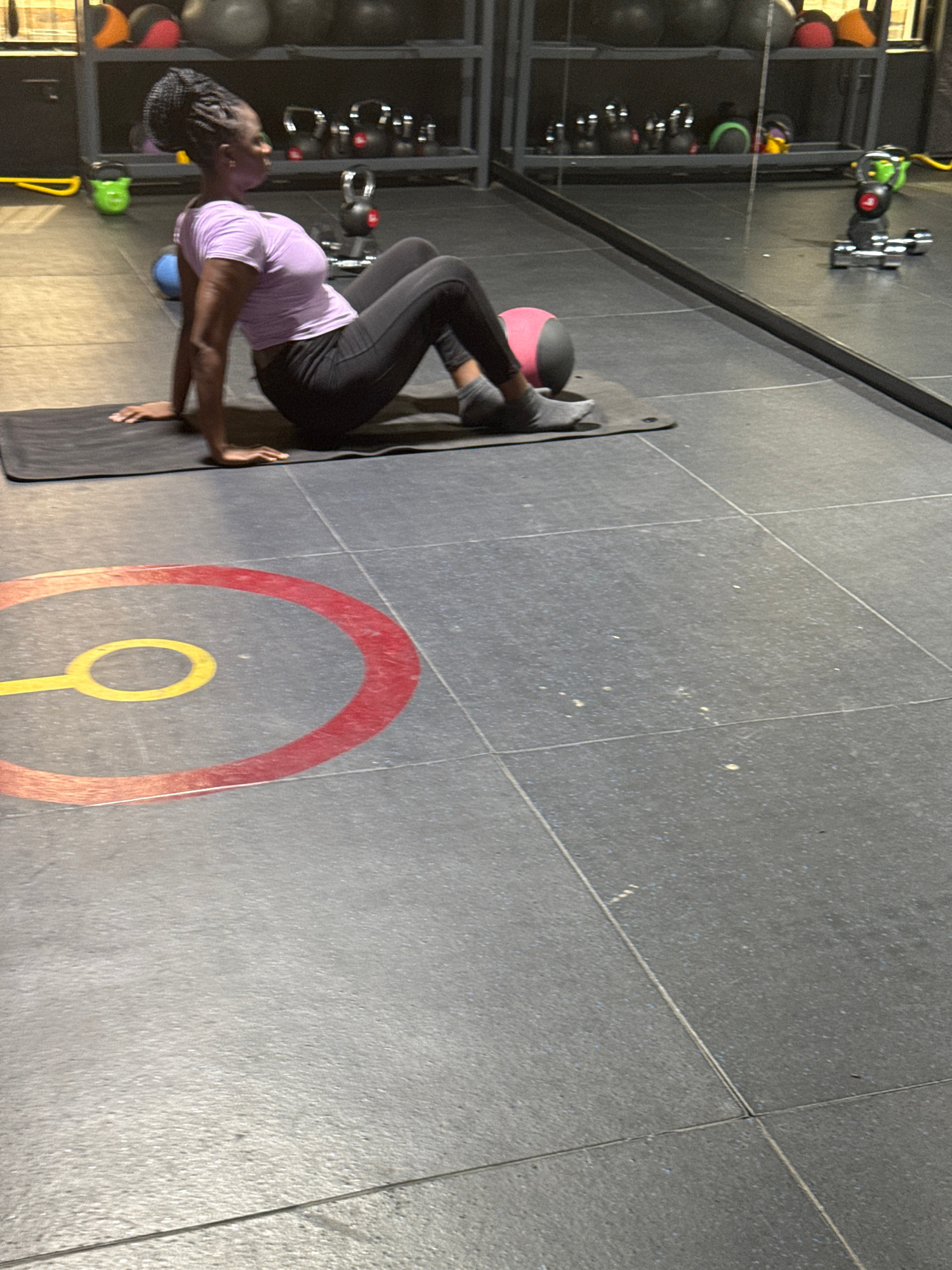 The image depicts an indoor scene within a gym or fitness center, possibly located in Rubuchi, Nigeria. A dark-skinned person, appearing to be female with braided hair, is engaged in a floor exercise…read more
