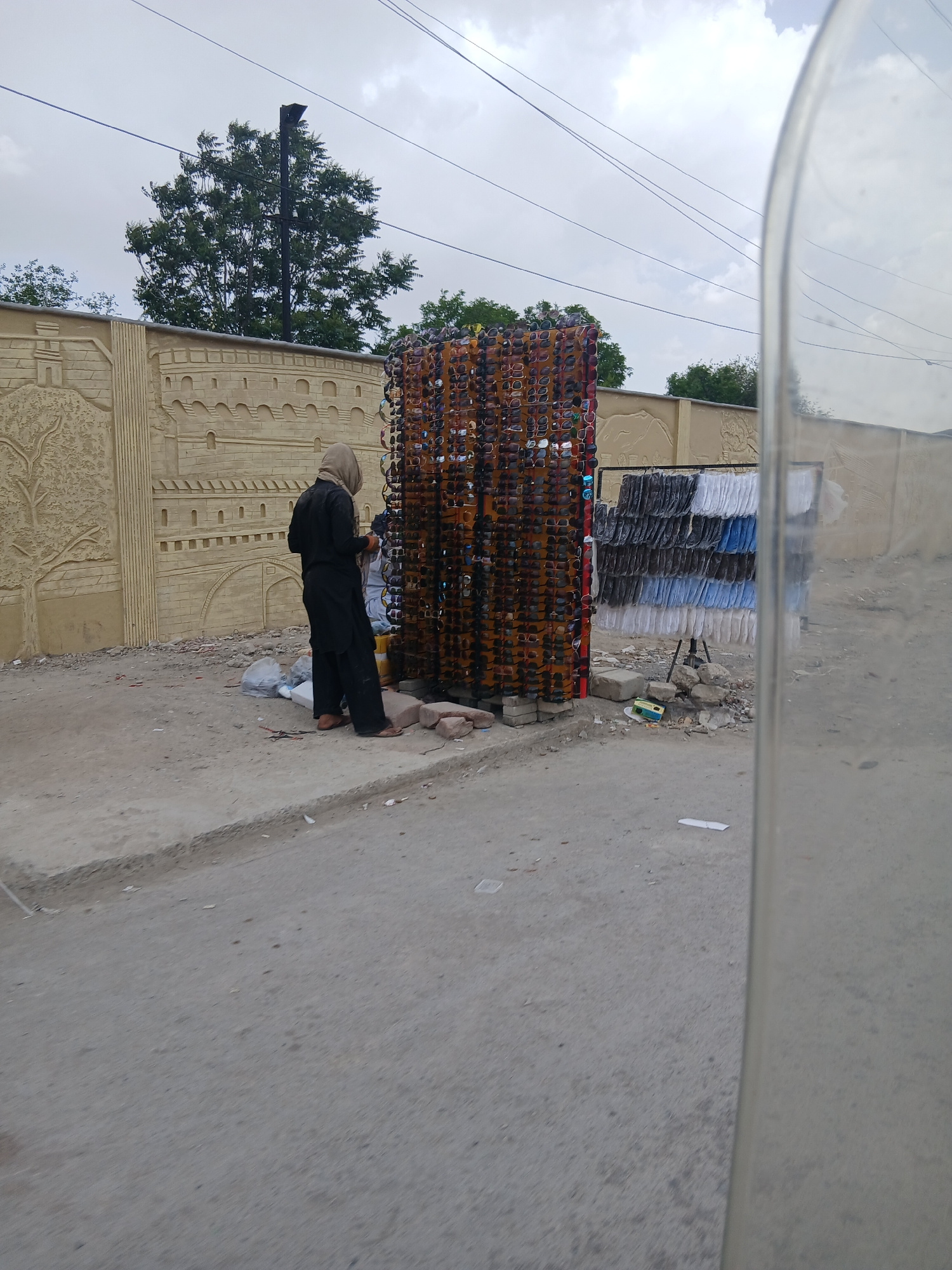 The image shows a street scene in Quetta City Tehsil, Pakistan. A man dressed in black stands next to a display rack filled with sunglasses, presumably a street vendor selling sunglasses. Behind the v…read more