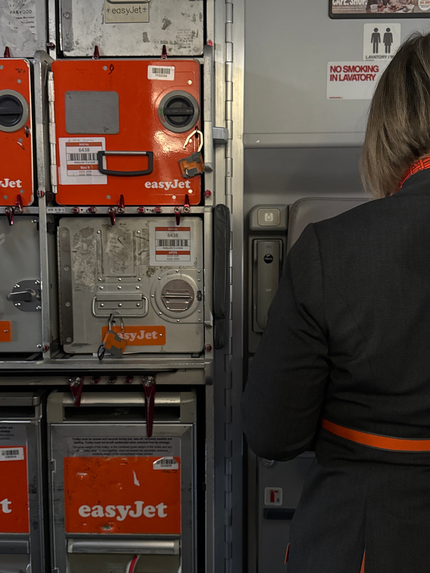The image shows an airplane interior with a flight attendant, recognizable by their grey uniform with an orange stripe. The attendant is positioned near a storage compartment containing several food a…read more