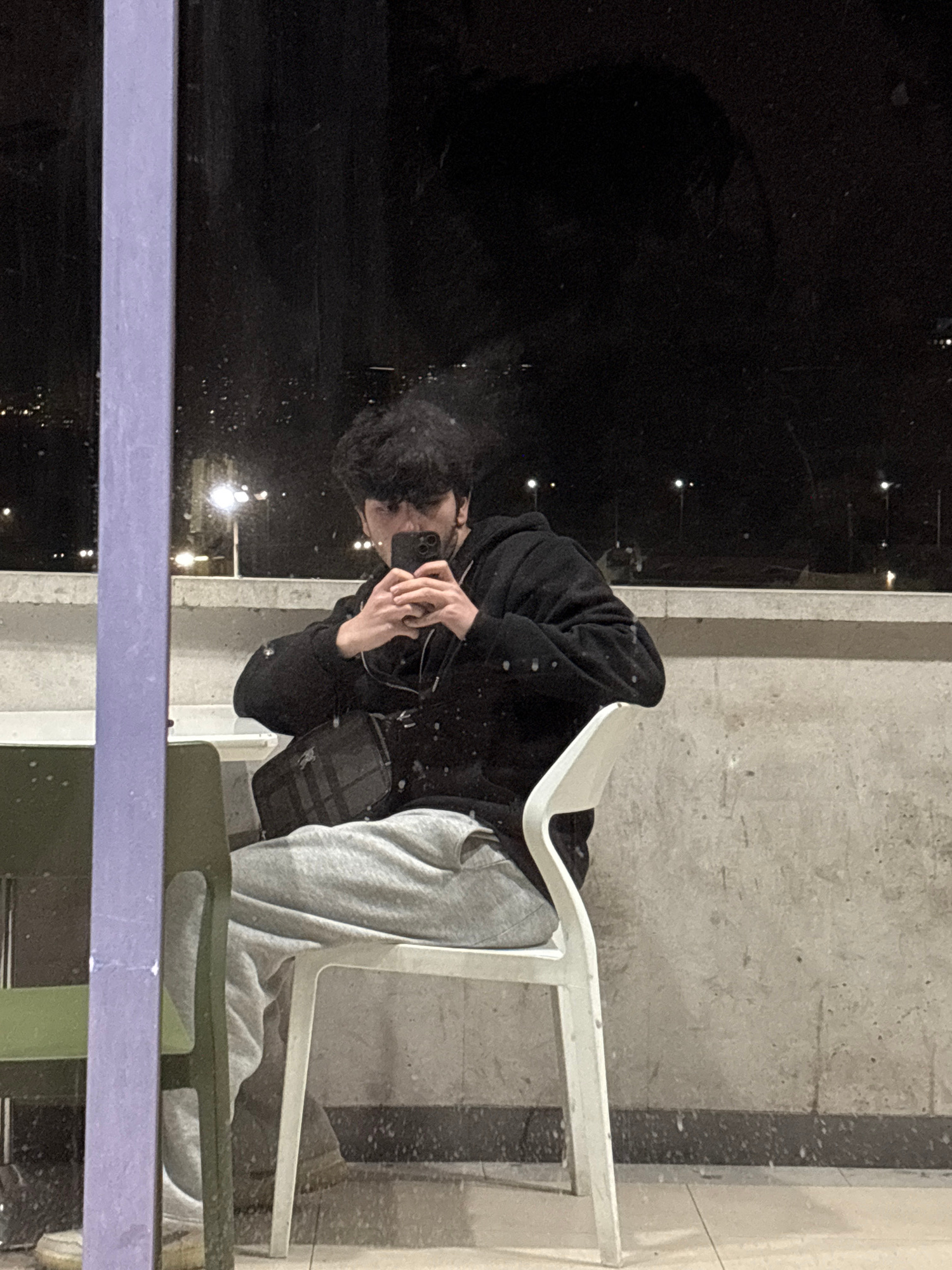 A person is reflected in a window. The person has dark hair and wears a black jacket and gray sweatpants. They hold a cell phone. The reflection also shows a white chair and a lavender-colored railing…read more