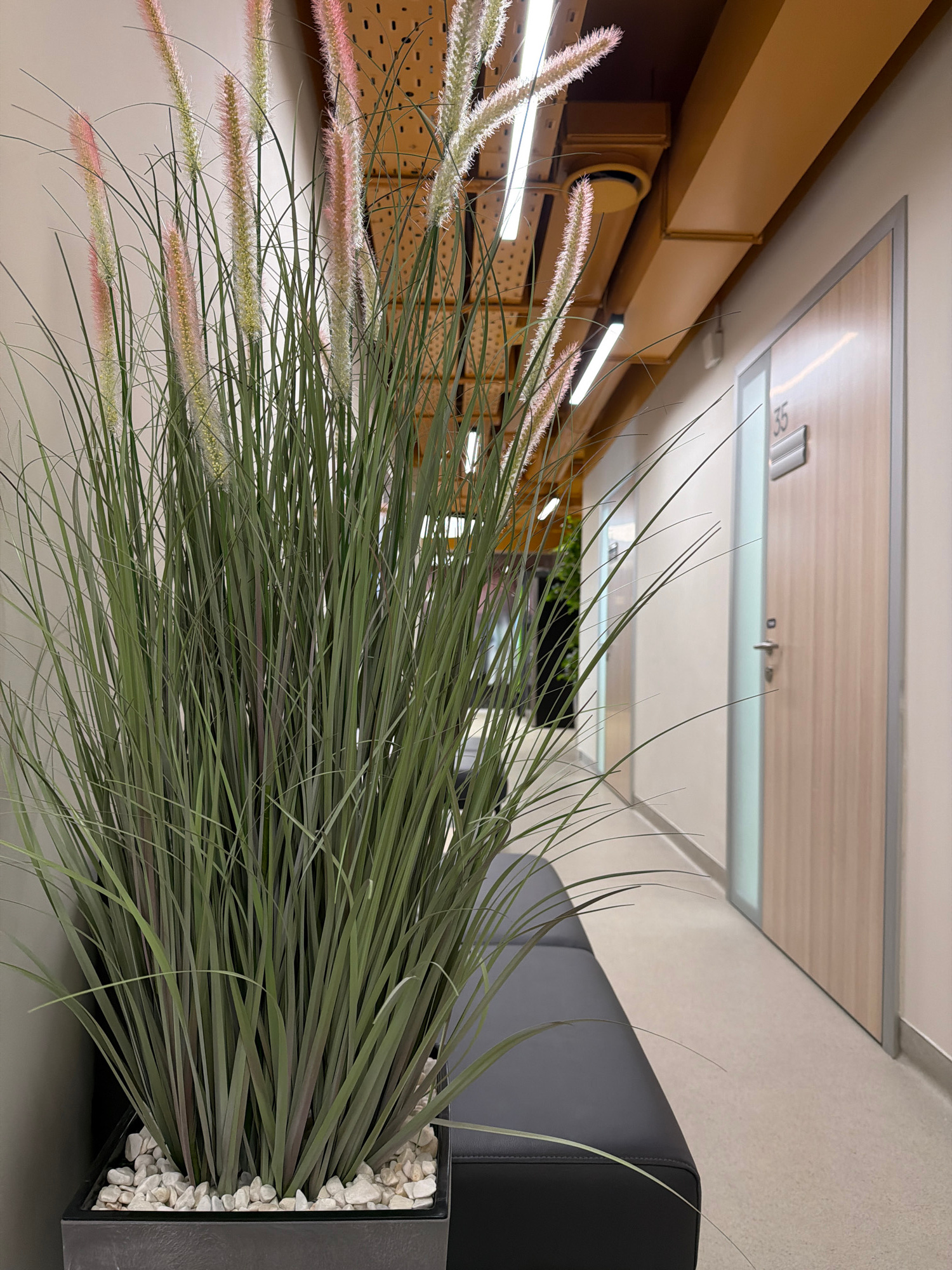 The image presents an indoor scene, likely a waiting area or office space. The focus is on a large decorative plant in a rectangular dark-colored pot filled with white stones. The plant has long, gree…read more