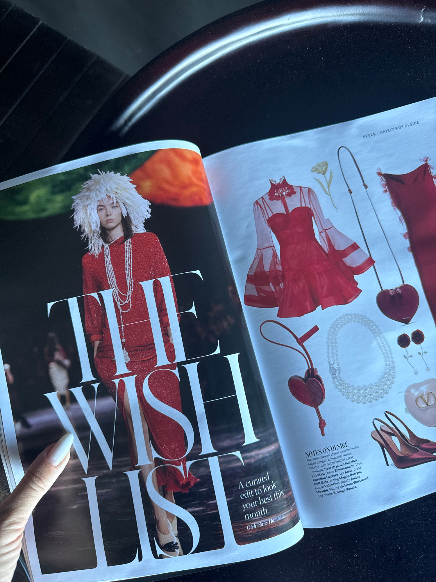 The image displays an open fashion magazine angled on a dark, reflective surface, likely a table. A person's finger, with a long white manicured nail, points towards the bottom right page. The magazi…read more