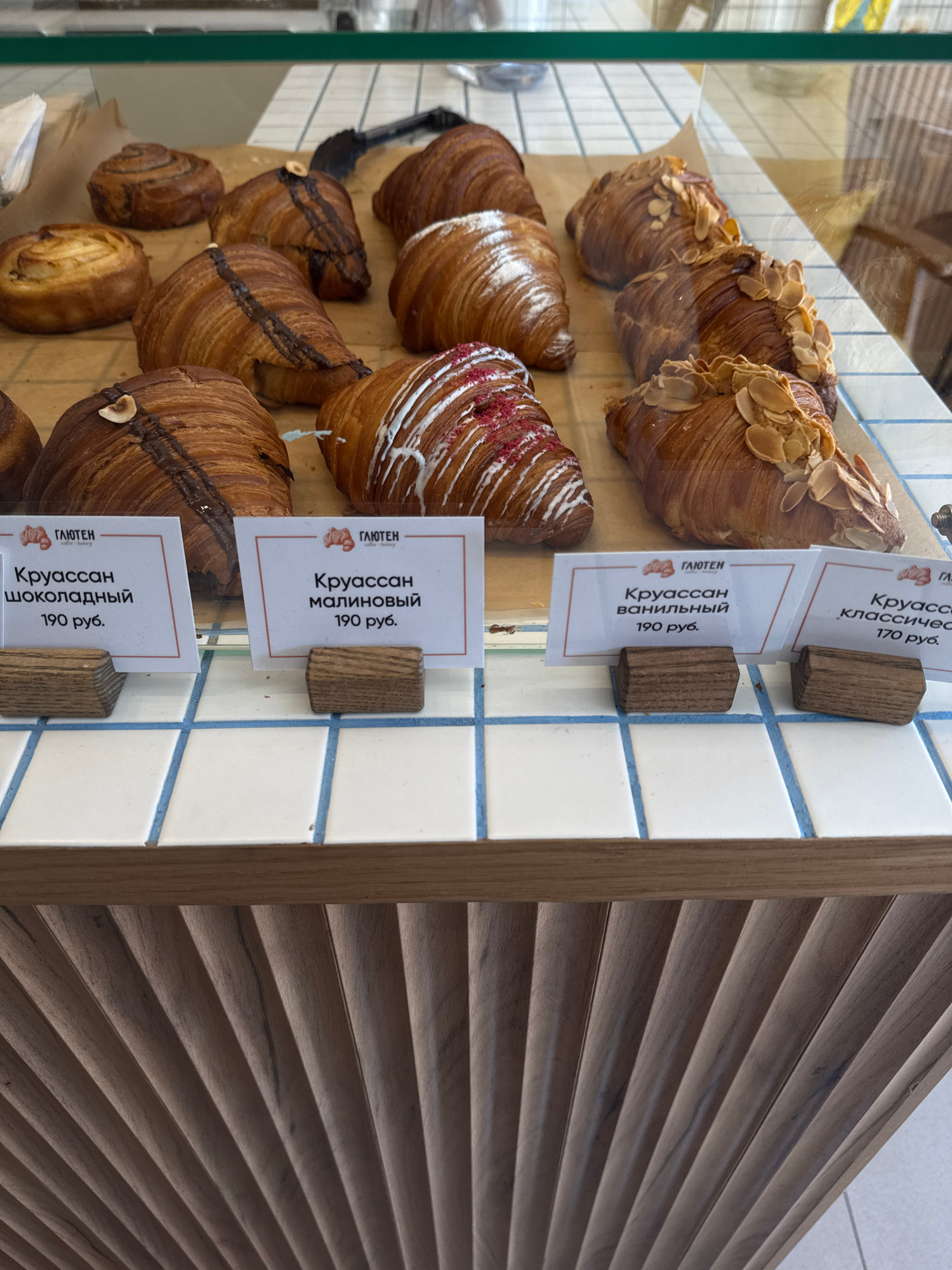 The image captures a close-up, angled view of various croissants displayed within a glass case at a bakery or cafe, likely in Sirius, Russia. The setting features a white tiled surface with blue grout…read more