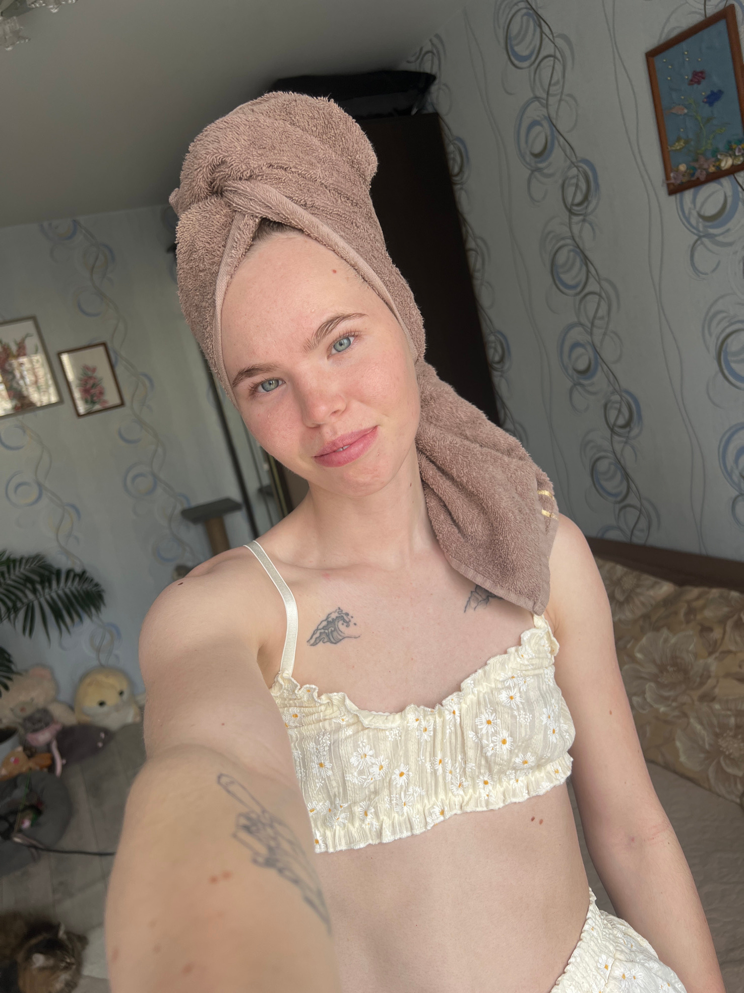 A selfie of a fair-skinned woman, possibly in Chaikovsky, Russia, is oriented vertically. She has a light brown towel wrapped around her head. She is wearing a white top with small yellow flower desig…read more