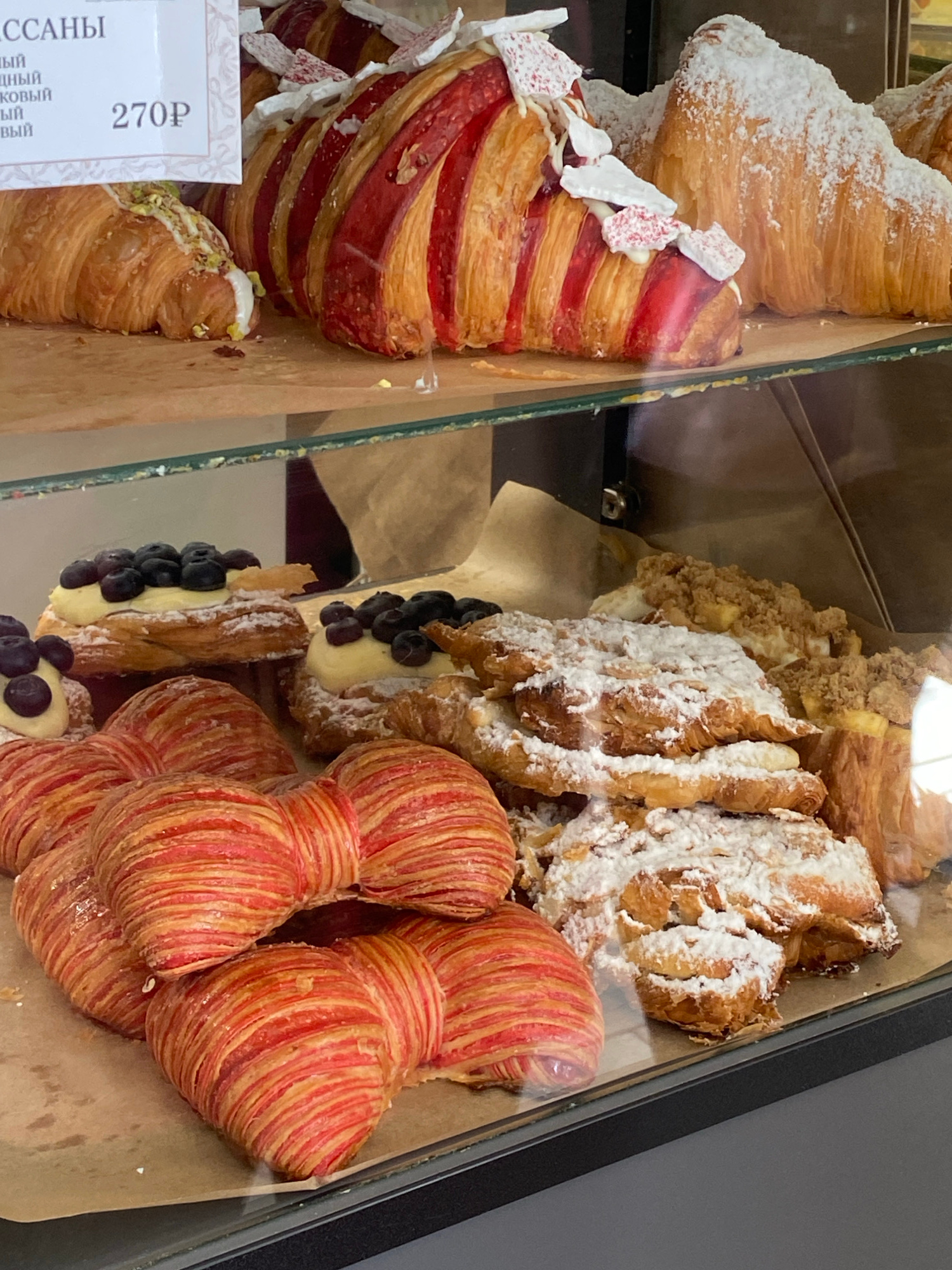 The image shows a display case filled with pastries, likely in a bakery or café. The pastries include croissants with red stripes, some topped with white decorative pieces, and others dusted with powd…read more