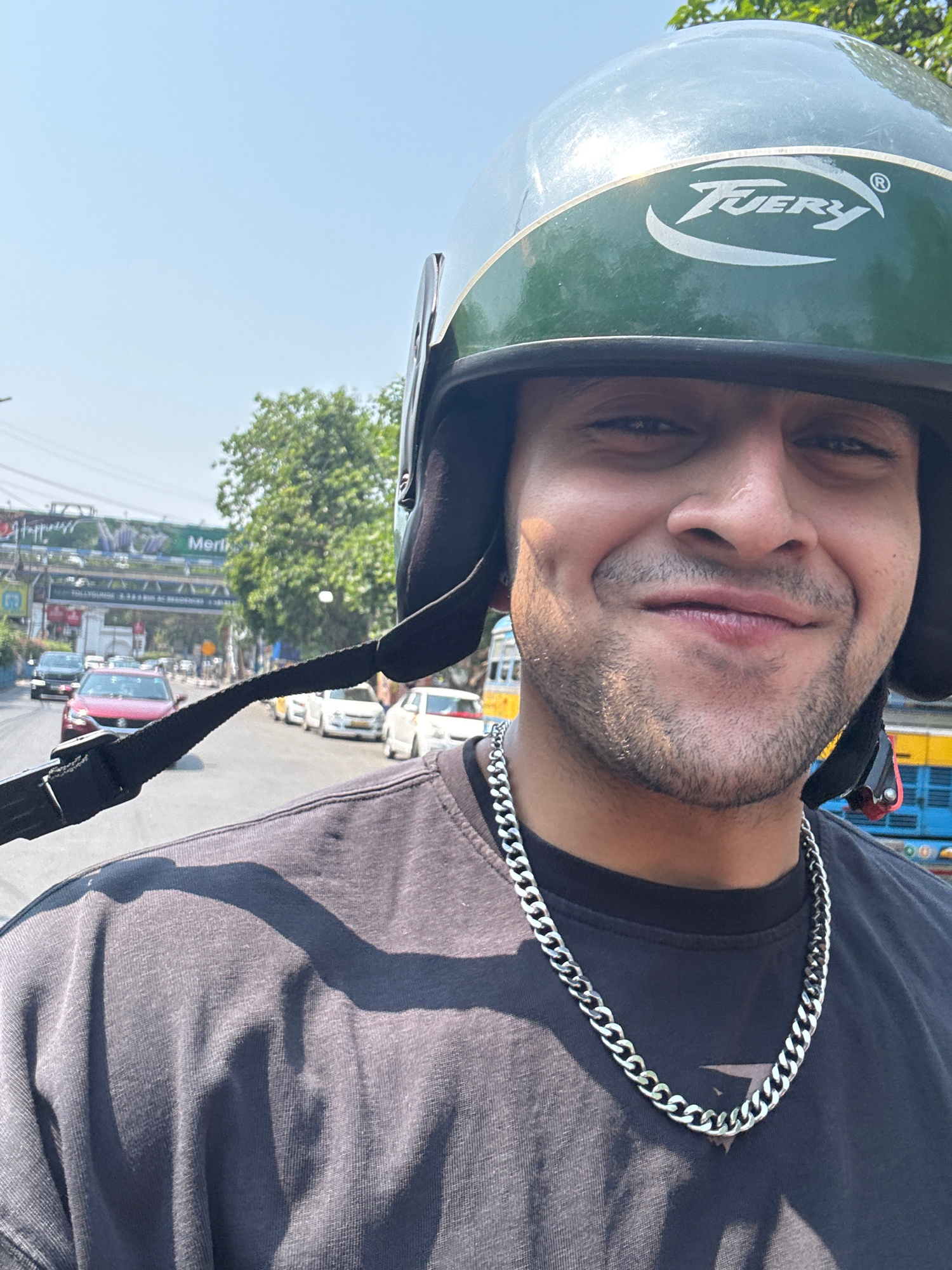 A selfie of a light-skinned man wearing a green helmet with the logo "Tuery" and a silver chain around his neck. He is wearing a dark t-shirt. The background shows a city street, and a sign that reads…read more