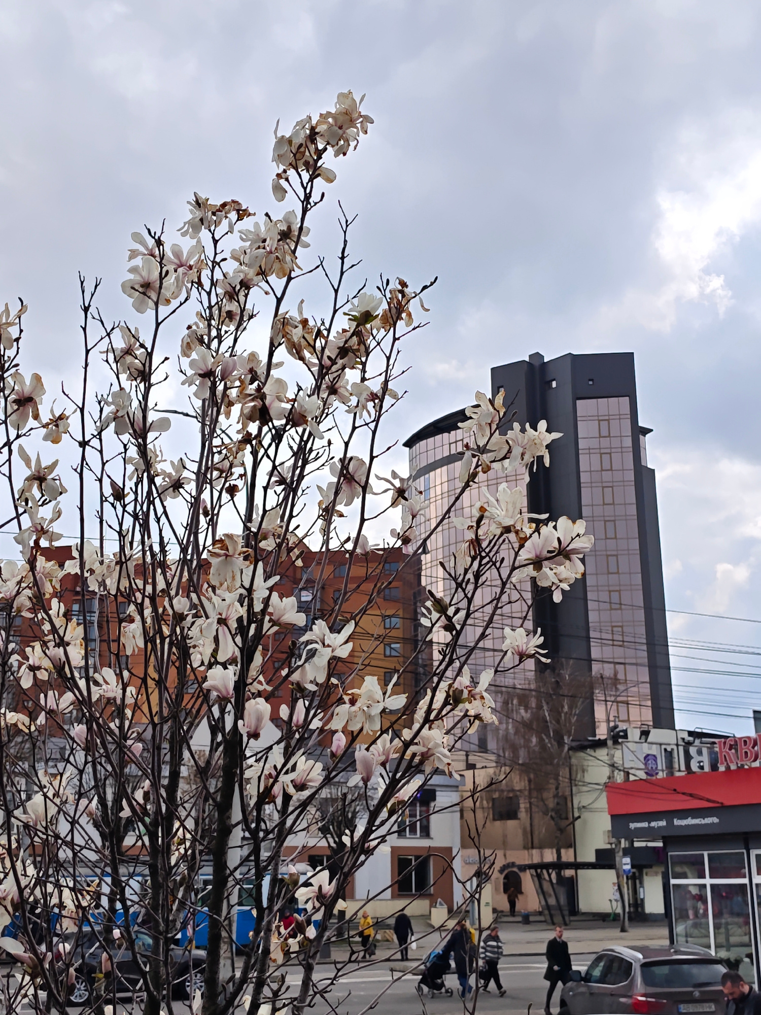 The image shows a flowering tree with white flowers in the foreground, obscuring parts of a cityscape. In the background, there are buildings of varying heights and architectural styles, including a t…read more