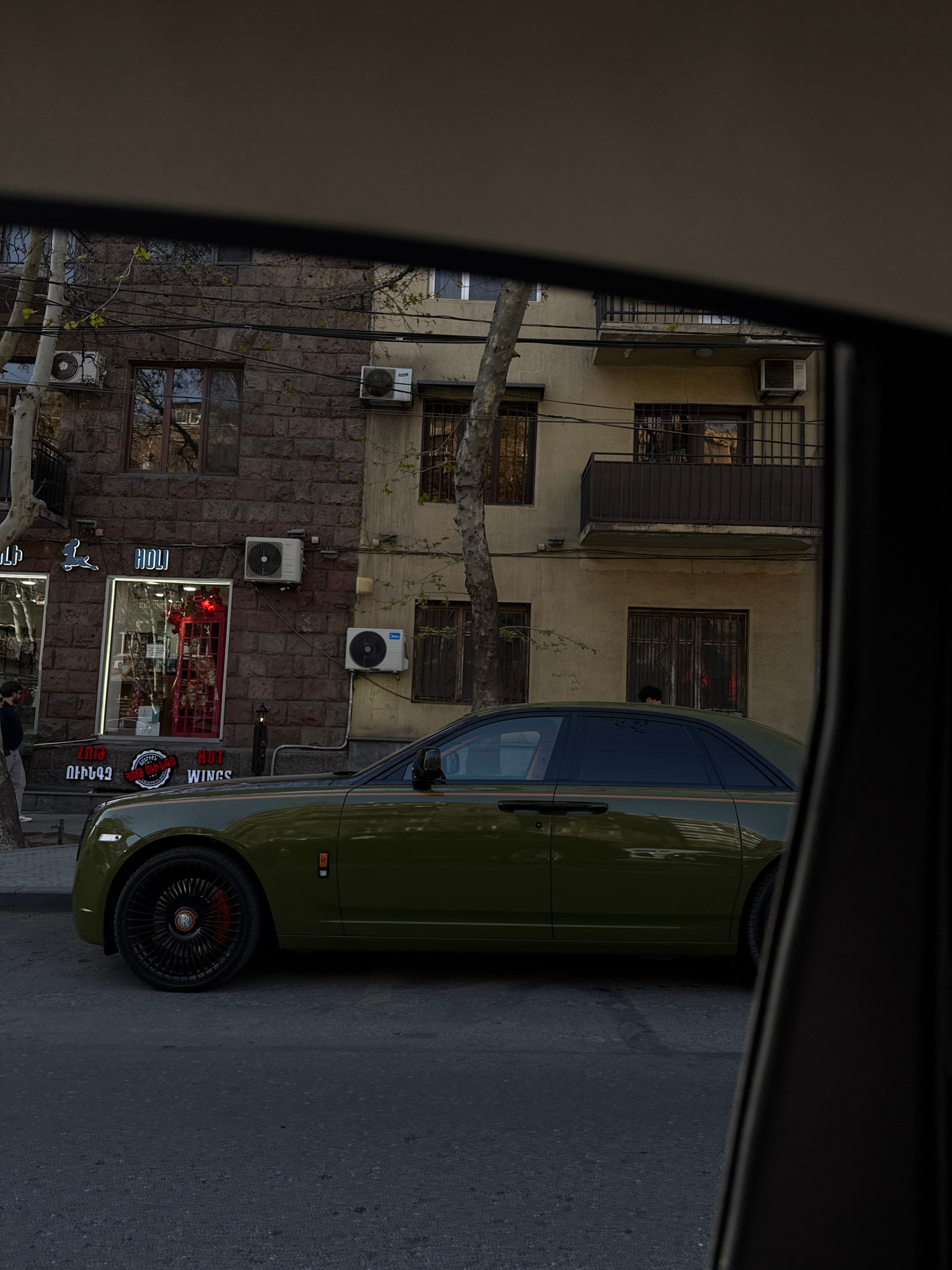 The vertically oriented image captures an urban street scene, viewed from inside a vehicle, framed by dark interior elements on the left and top edges. A dark olive-green sedan is parked on the asphal…read more