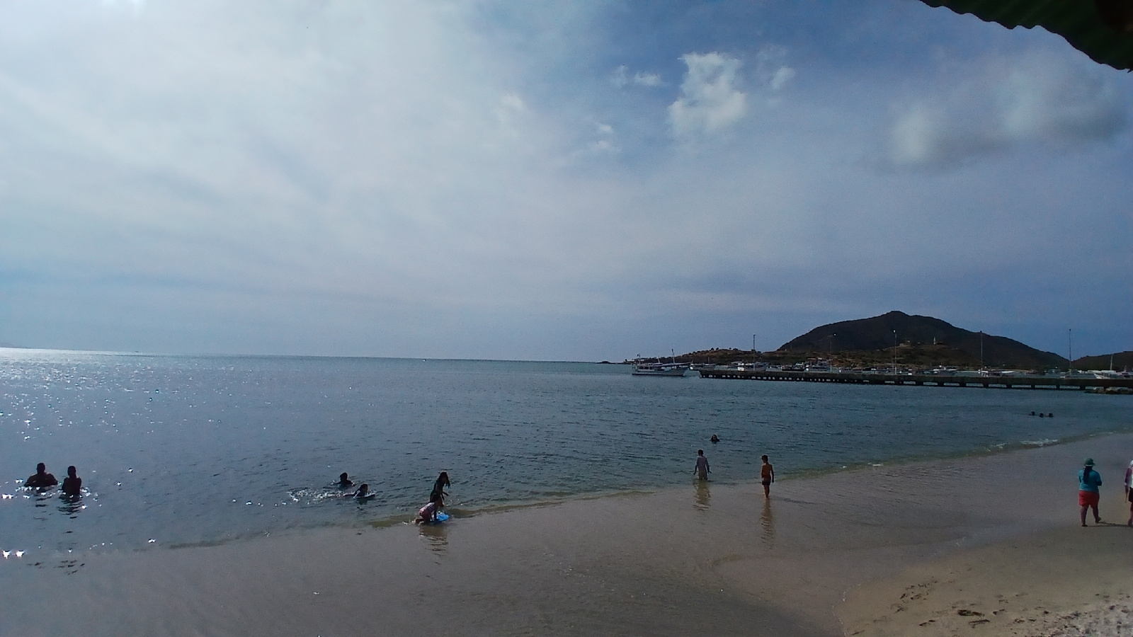 The image depicts a coastal scene in Juan Griego, Venezuela. The sky is partly cloudy with diffused sunlight reflecting on the water's surface. In the foreground, a sandy beach slopes into the ocean.…read more