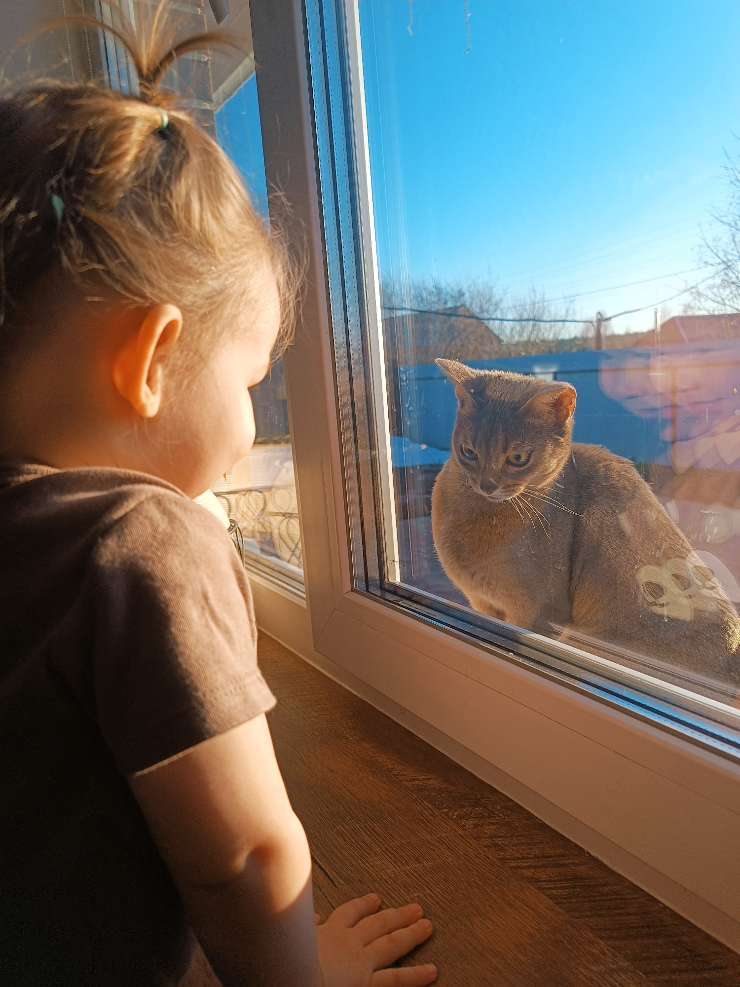 A young child with light brown hair in a ponytail stands indoors at a window, looking at a brown cat sitting outside. The window is white-framed and reflects a clear blue sky and some bare trees. The…read more