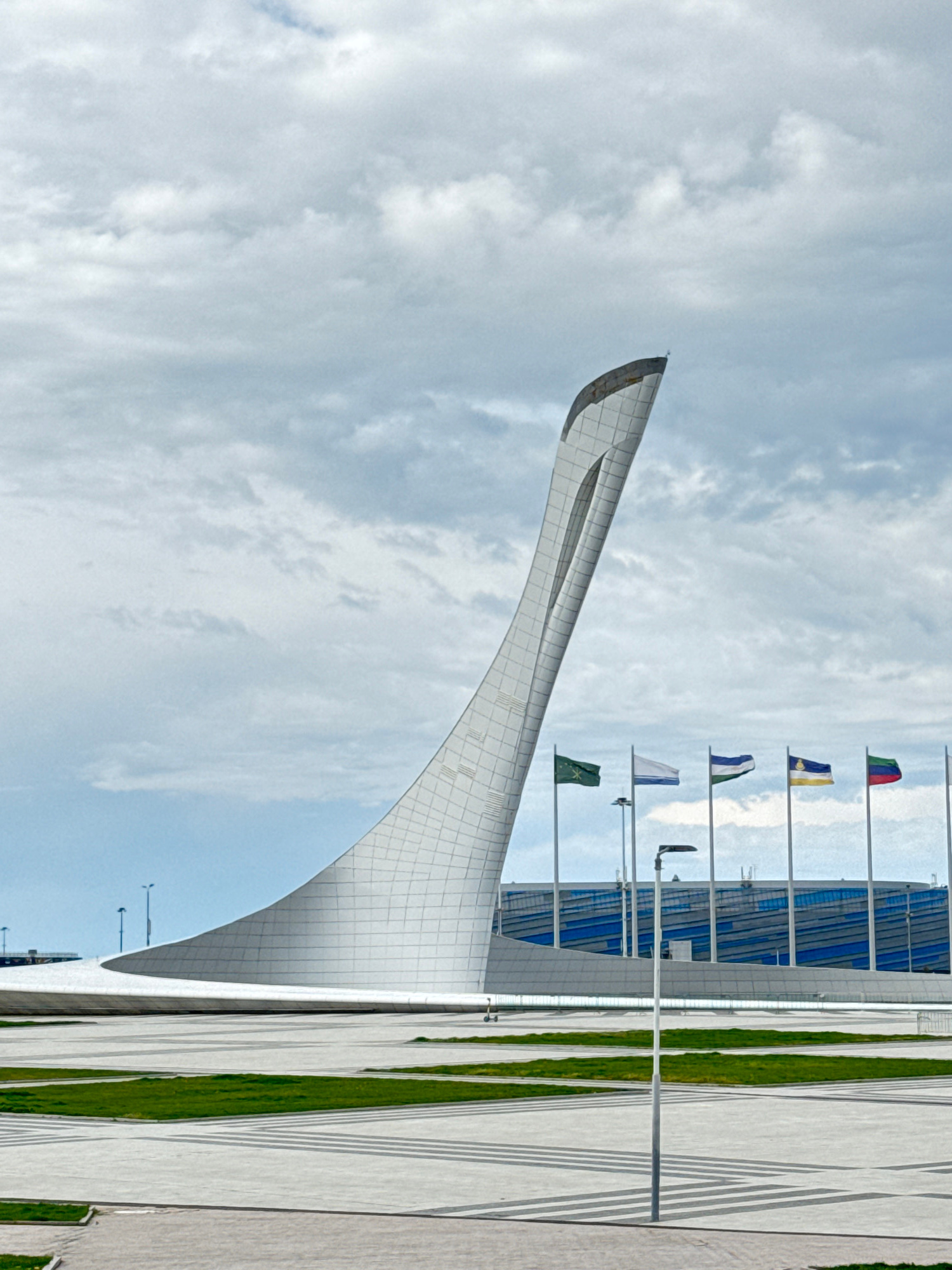 The image shows the Bolshoy Ice Dome and the Olympic flame tower in the Olympic Park in Sirius, Russia. The flame tower is a large, stylized, arching white structure made of rectangular panels. A seri…read more
