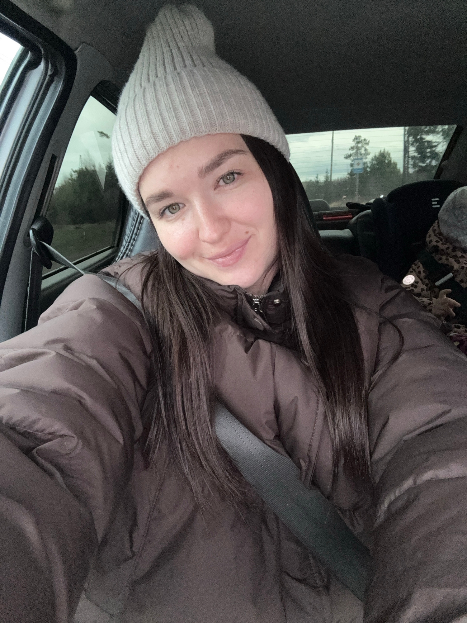 A young woman is captured in a close-up, likely a selfie, within a car interior. She has long, dark hair, light-colored eyes (appearing green or hazel), and a fair complexion, with a faint smile on he…read more