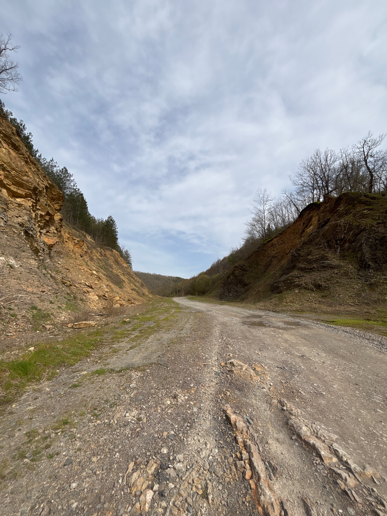 The image shows a gravel road or path flanked by rock cliffs or embankments on either side. The left embankment is darker, possibly damp or mossy, with bare trees near the top. The right embankment is…read more