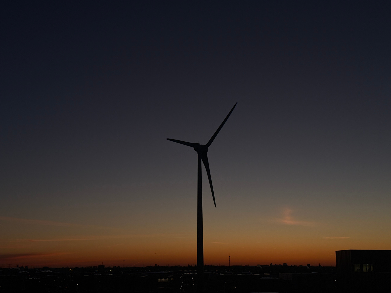 The image depicts a silhouetted wind turbine against a sunset sky in Maasdijk, Netherlands. The sky transitions from dark blue at the top to orange near the horizon. The wind turbine stands prominentl…read more