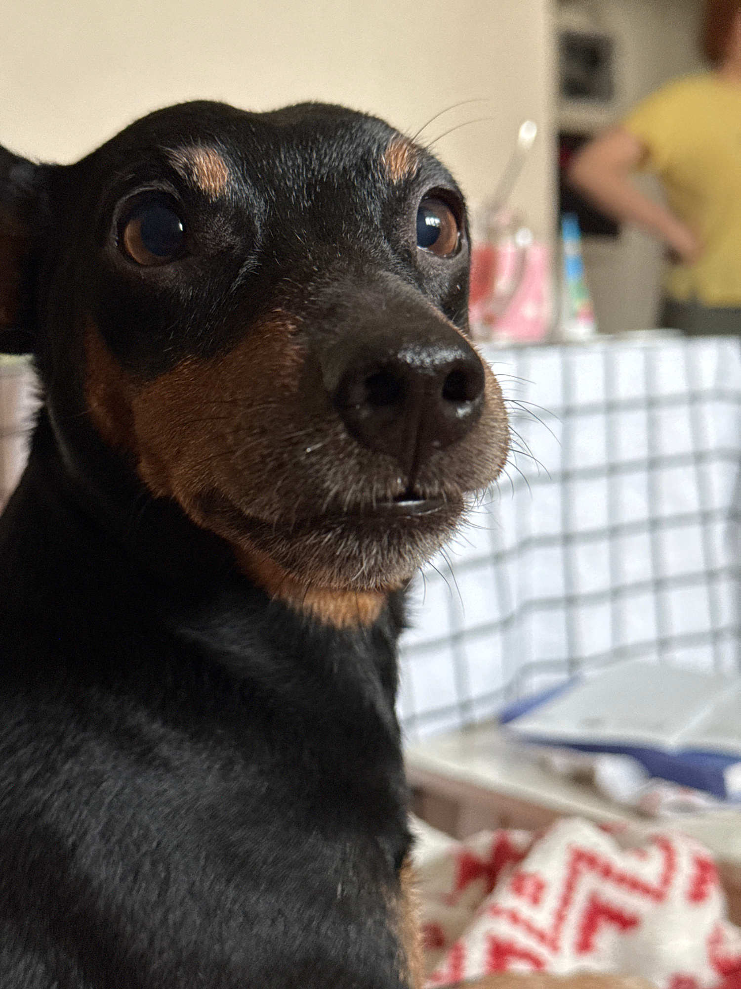 The media file displays a close-up, Dutch angle portrait of a small, short-haired dog, likely a Dachshund, with black and tan markings. The dog's head is tilted, and its gaze is directed intently towa…read more