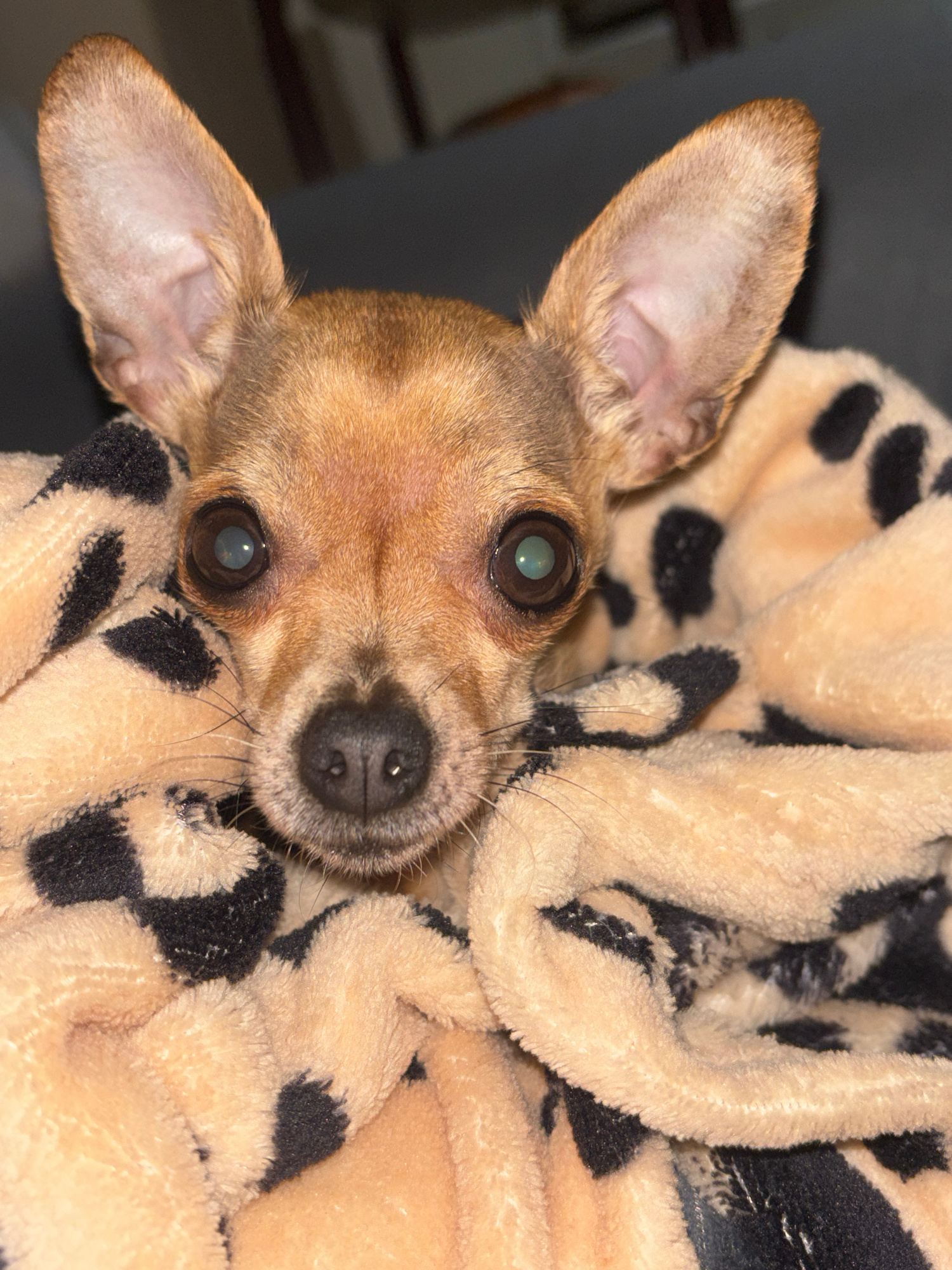 A tan chihuahua is wrapped in a tan and black patterned fleece blanket. The dog is facing the camera. The environment is likely indoors. There is no verifiable evidence indicating the location is in P…read more