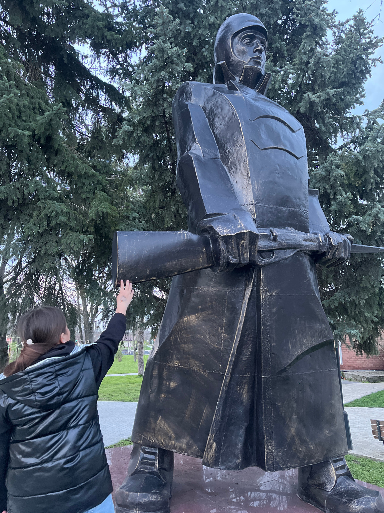 The image shows a large bronze statue of a soldier holding a rifle in a park-like setting. The statue is the main subject, dominating the frame with its dark, metallic finish. The soldier is wearing a…read more