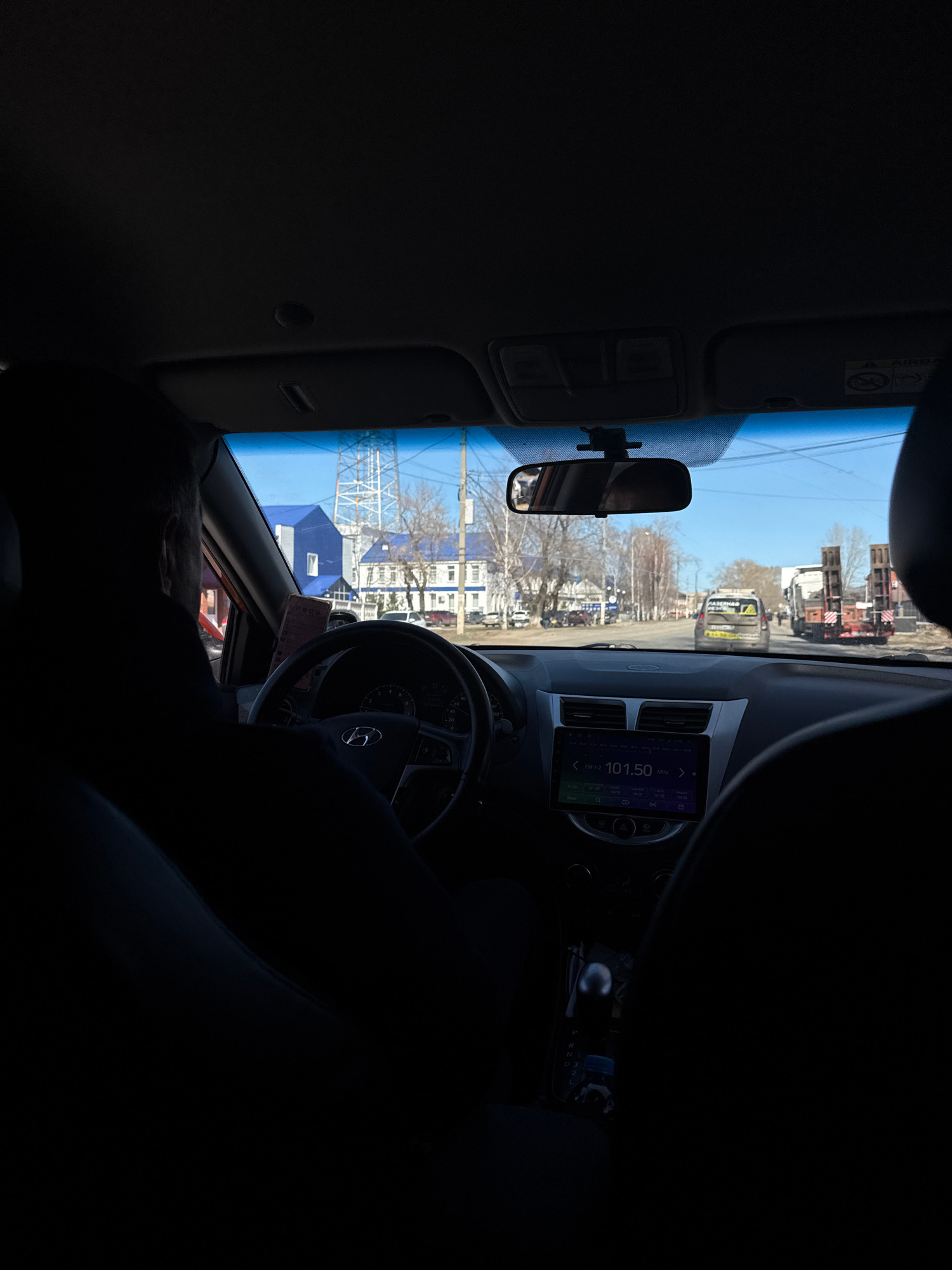 A view from inside a car, presumably the driver's perspective, looking out onto a street in Chaikovsky, Russia. The radio display reads "PMTZ 101.50 MHz." Several buildings and vehicles are visible on…read more