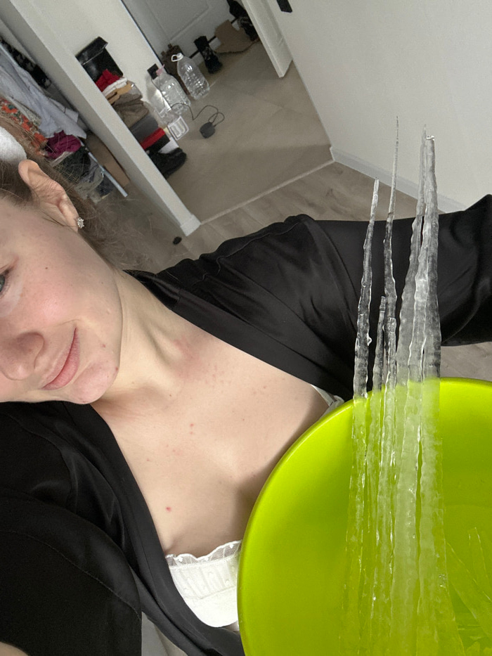 A person faces the camera, a green bowl hovering over their chest. Long, translucent strips rest on the bowl's edge, extending like icicles. The person wears a black garment over a white top with lace…read more
