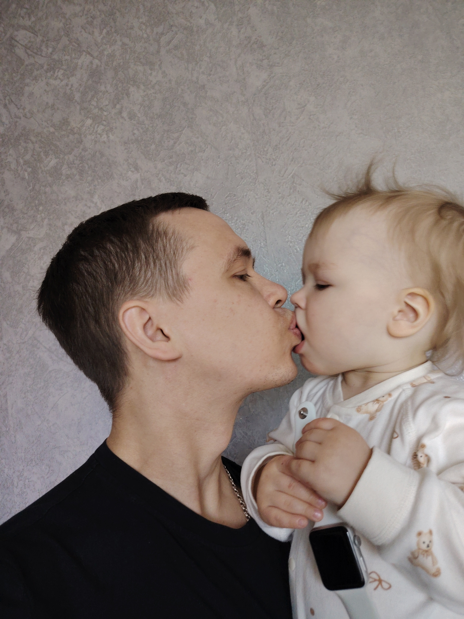 A man and a baby are kissing in front of a gray wall. The man has dark hair and is wearing a black t-shirt with a silver chain around his neck. The baby has blonde hair and is wearing a white onesie w…read more