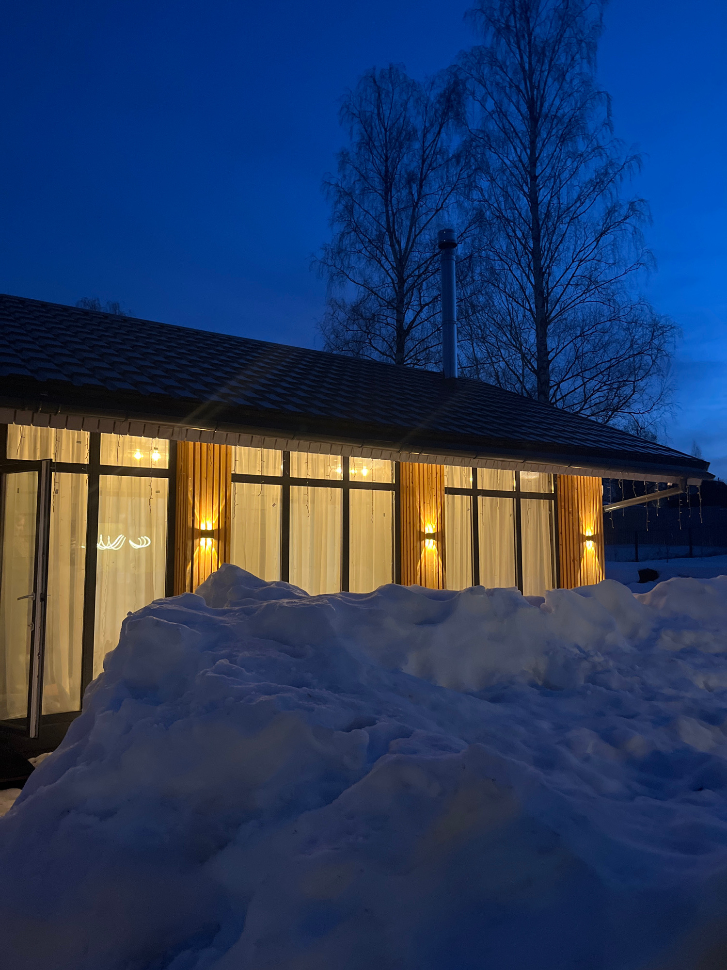 The image shows a building in Новая Чернушка, Russia, at night. The building has a brick exterior, large windows, and wooden accents. Snow is piled up against the side of the building. The sky is dark…read more