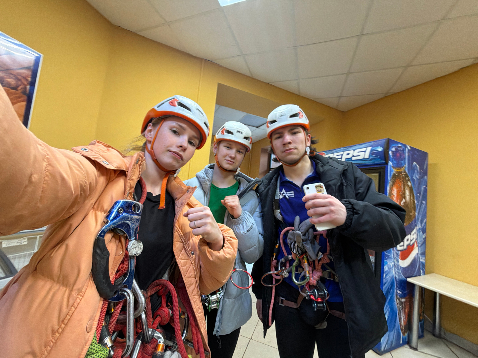 Three people, likely climbers, stand in an indoor space. The individuals wear climbing helmets and climbing harnesses with various carabiners and ropes attached. The person on the left holds a phone.…read more