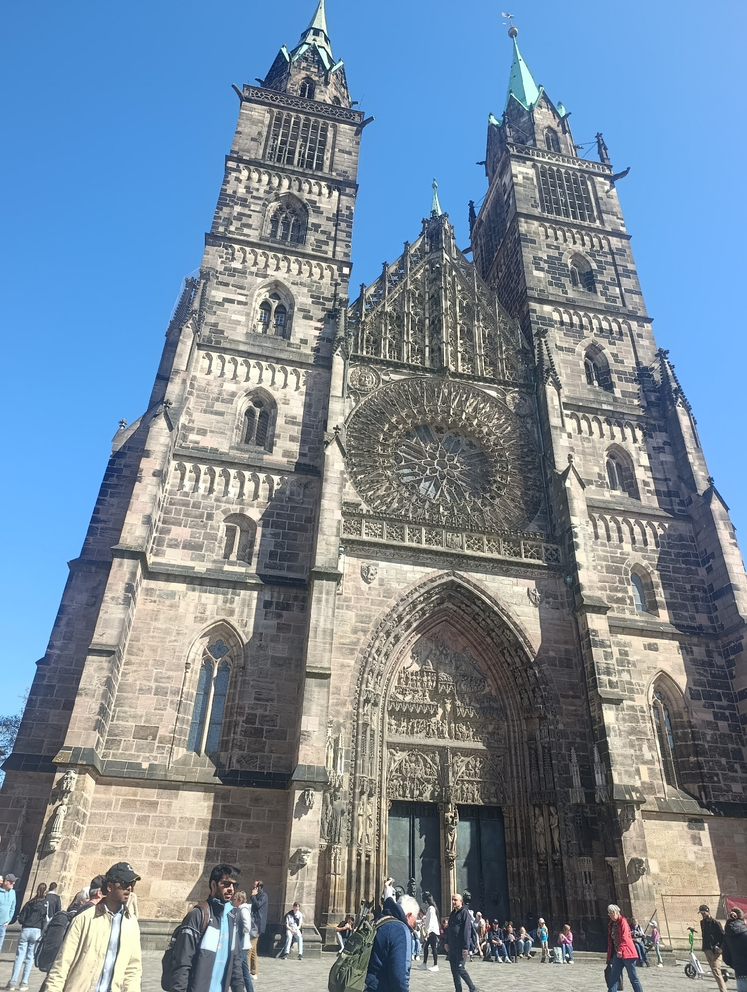 The image depicts the St. Lorenz Church in Nuremberg, Germany. It is a large, stone church with two prominent towers featuring green spires. A large rose window is prominently displayed above the main…read more