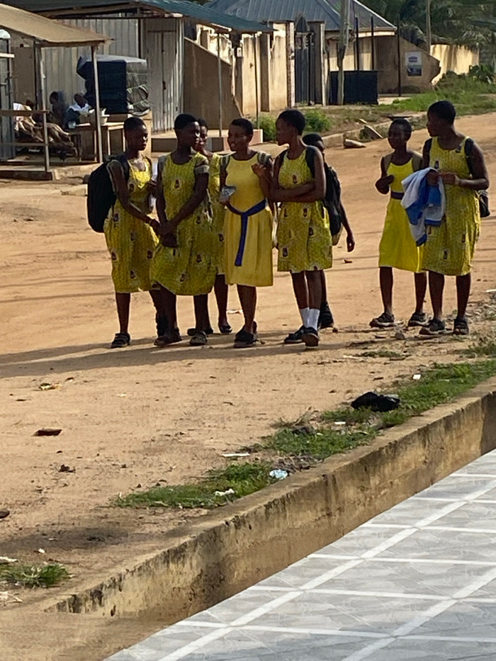 Seven young women stand in a line wearing yellow uniforms, some with blue sashes. The women have dark complexions and are evenly spaced. They stand on a dirt road with buildings visible in the backgro…read more