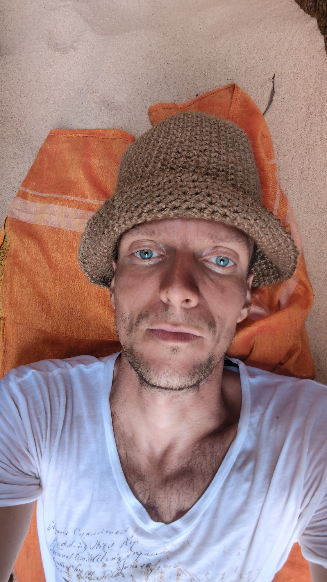 A light-skinned male with blue eyes, a short beard, and a brown knit cap lies on an orange patterned cloth. The cloth rests on sandy ground. He wears a white t-shirt with designs on the front. The sce…read more