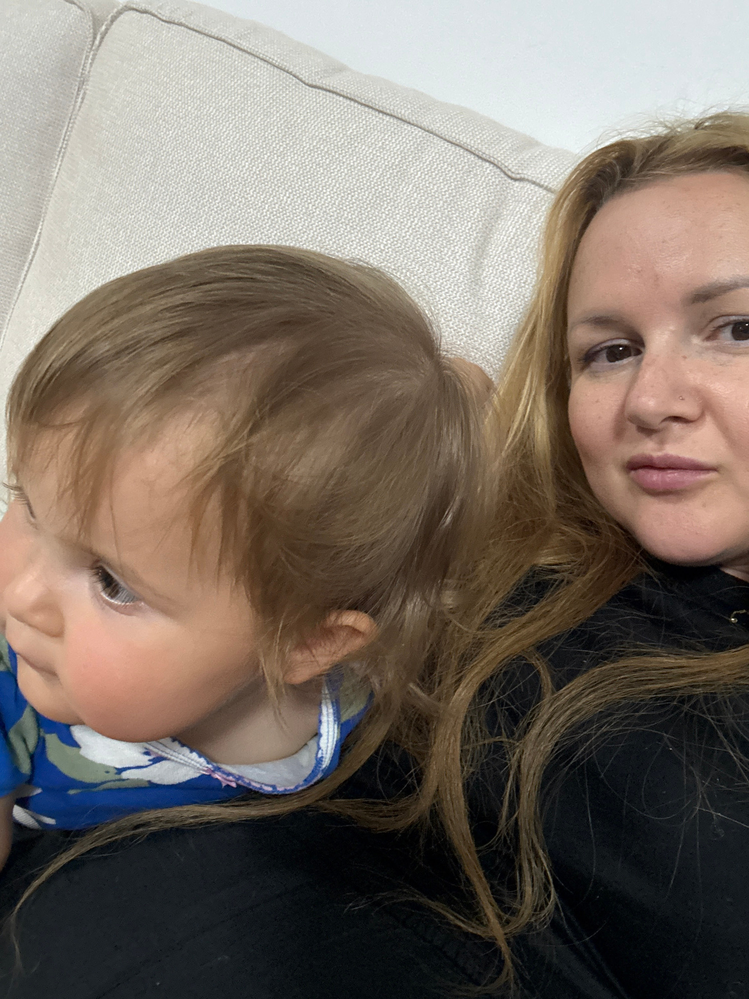 This image captures an intimate, overhead view of an adult and a young child lying together on a light-colored couch or cushion, likely indoors in a home setting in Ramat Gan, Israel. The adult, posi…read more