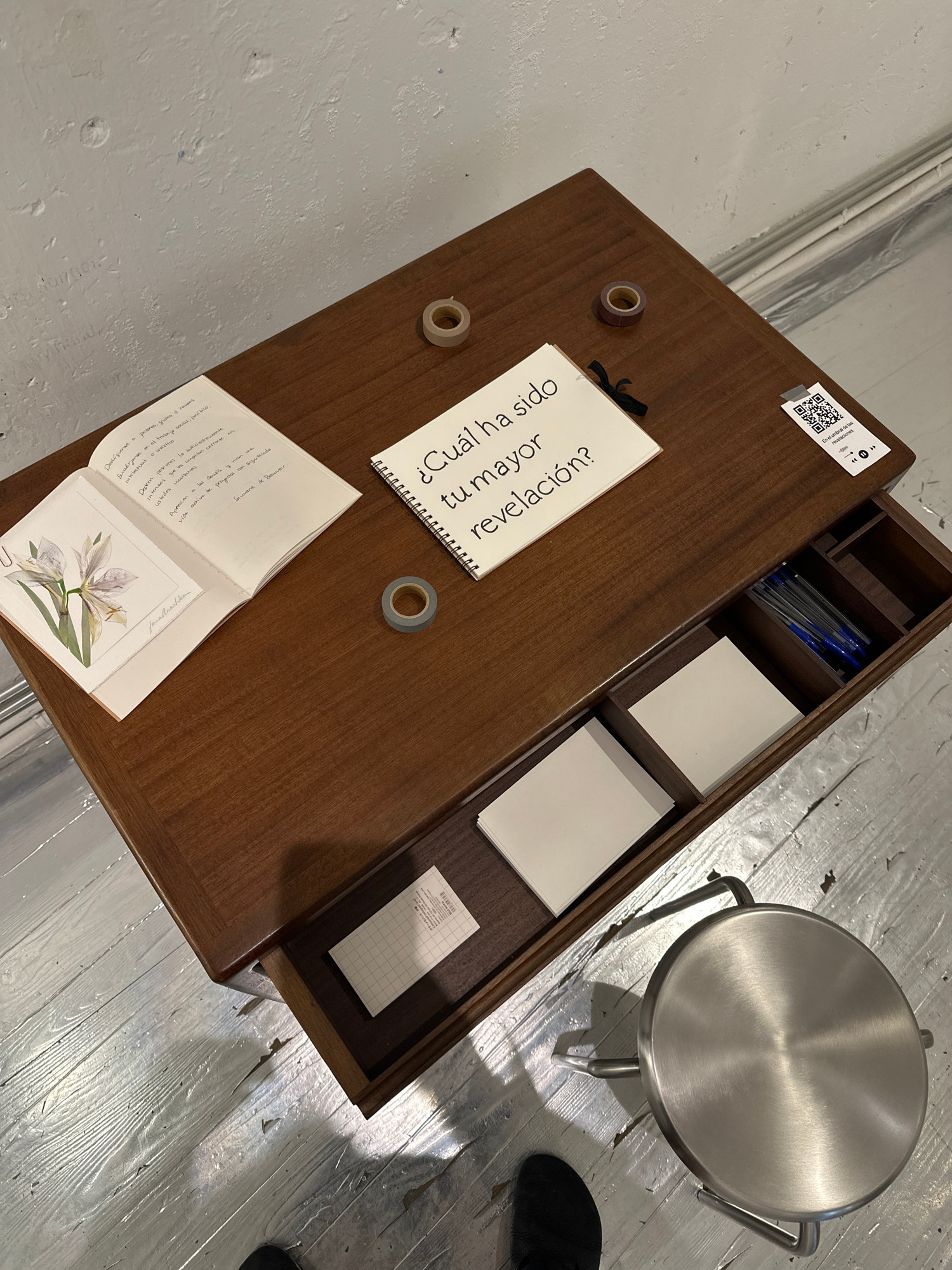 The scene is an art installation. A wooden desk with an open drawer contains supplies like pens, blank cards, and grid paper. A notebook on the desk poses the question, "¿Cuál ha sido tu mayor revelac…read more